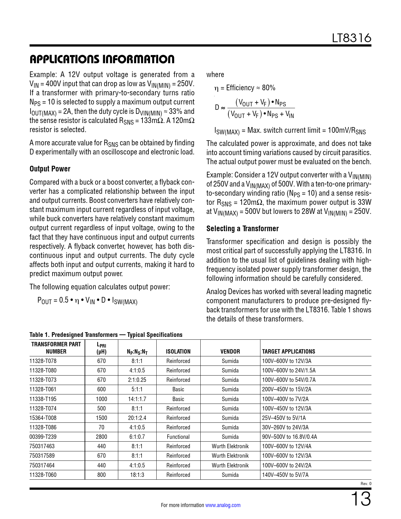 Pages / Page26 / 13 — APPLICATIONS INFORMATION. Output Power. Selecting a Transformer. Table 1. …