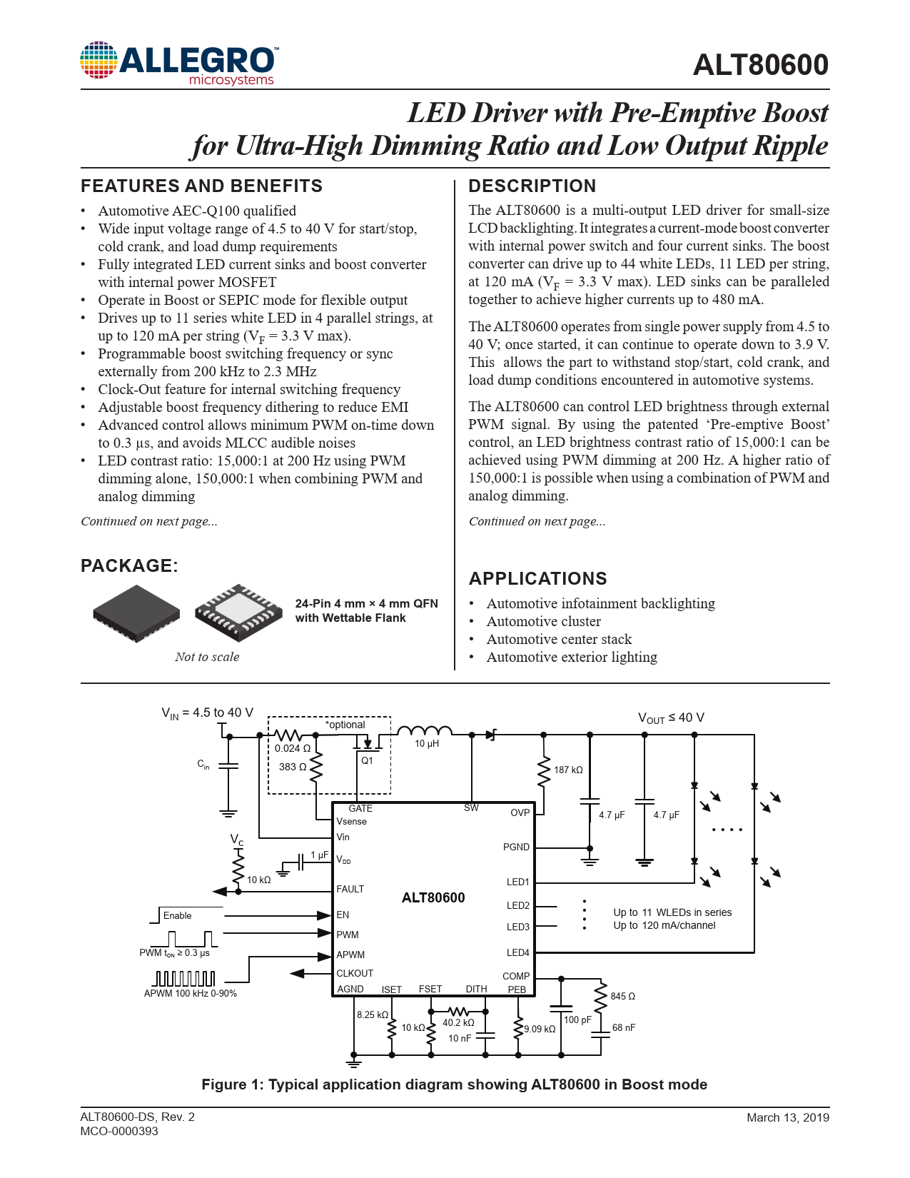 ALT80600-DS, Rev. 2 March 13, 2019 MCO-0000393 Document Outline Features and Benefits Description Applications Package Selection Guide Absolute Maximum Ratings Thermal Characteristics Typical Application – SEPIC Functional Block Diagram Pinout Diagram and Terminal List Electrical Characteristics Functional Description Enabling the IC Powering Up: LED Detection Phase Powering Up: Boost Output Undervoltage Soft Start Function Frequency Selection Synchronization Loss of External Sync Signal Switching Frequency Dithering Clock Out Function LED Current Setting PWM Dimming Pre-Emptive Boost (PEB) Analog Dimming with APWM Pin Extending LED Dimming Ratio Analog Dimming with External Voltage VDD Shutdown Fault Detection and Protection LED String Partial-Short Detect Boost Switch Overcurrent Protection Input Overcurrent Protection and Disconnect Switch Setting the Current Sense Resistor Input UVLO Fault Protection During Operation Fault Recovery Mechanism Package Outline Drawing Appendix A: Design Example