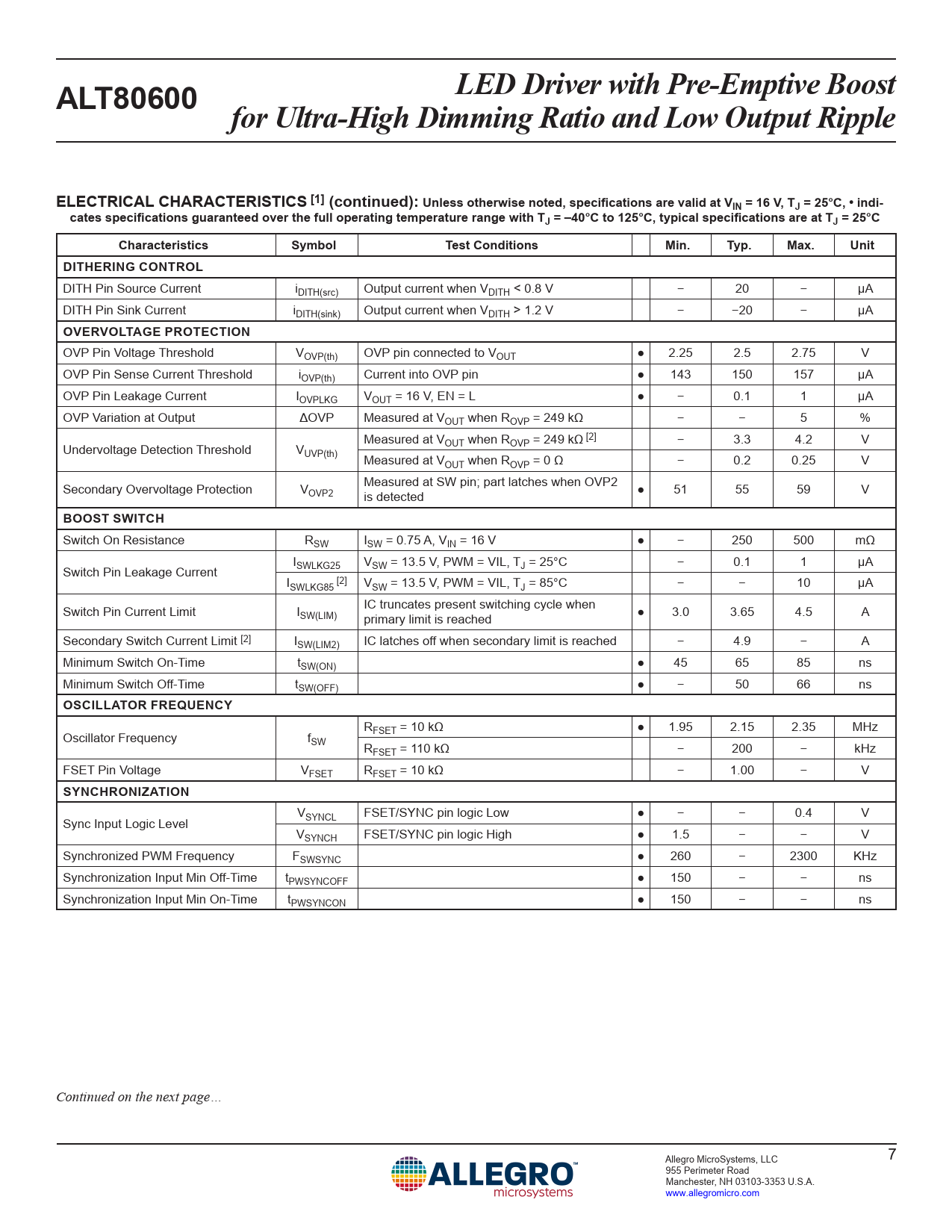 LED Driver with Pre-Emptive BoostALT80600 for Ultra-High Dimming Ratio and Low Output RippleELECTRICAL CHARACTERISTICS [1] (continued): Unless otherwise noted, specifications are valid at VIN = 16 V, TJ = 25°C, • indi-cates specifications guaranteed over the full operating temperature range with TJ = –40°C to 125°C, typical specifications are at TJ = 25°CCharacteristicsSymbolTest ConditionsMin.Typ.Max.UnitDITHERING CONTROL DITH Pin Source Current iDITH(src) Output current when VDITH < 0.8 V − 20 − μA DITH Pin Sink Current iDITH(sink) Output current when VDITH > 1.2 V − −20 − μA OVERVOLTAGE PROTECTION OVP Pin Voltage Threshold VOVP(th) OVP pin connected to VOUT ● 2.25 2.5 2.75 V OVP Pin Sense Current Threshold iOVP(th) Current into OVP pin ● 143 150 157 µA OVP Pin Leakage Current IOVPLKG VOUT = 16 V, EN = L ● − 0.1 1 µA OVP Variation at Output ΔOVP Measured at VOUT when ROVP = 249 kΩ − − 5 % Measured at V Undervoltage Detection Threshold V OUT when ROVP = 249 kΩ [2] − 3.3 4.2 V UVP(th) Measured at VOUT when ROVP = 0 Ω − 0.2 0.25 V Secondary Overvoltage Protection V Measured at SW pin; part latches when OVP2 OVP2 is detected ● 51 55 59 V BOOST SWITCH Switch On Resistance RSW ISW = 0.75 A, VIN = 16 V ● − 250 500 mΩ I Switch Pin Leakage Current SWLKG25 VSW = 13.5 V, PWM = VIL, TJ = 25°C − 0.1 1 µA ISWLKG85 [2] VSW = 13.5 V, PWM = VIL, TJ = 85°C − − 10 µA Switch Pin Current Limit I IC truncates present switching cycle when SW(LIM) primary limit is reached ● 3.0 3.65 4.5 A Secondary Switch Current Limit [2] ISW(LIM2) IC latches off when secondary limit is reached − 4.9 − A Minimum Switch On-Time tSW(ON) ● 45 65 85 ns Minimum Switch Off-Time tSW(OFF) ● − 50 66 ns OSCILLATOR FREQUENCY R Oscillator Frequency f FSET = 10 kΩ ● 1.95 2.15 2.35 MHz SW RFSET = 110 kΩ − 200 − kHz FSET Pin Voltage VFSET RFSET = 10 kΩ − 1.00 − V SYNCHRONIZATION V Sync Input Logic Level SYNCL FSET/SYNC pin logic Low ● − − 0.4 V VSYNCH FSET/SYNC pin logic High ● 1.5 − − V Synchronized PWM Frequency FSWSYNC ● 260 − 2300 KHz Synchronization Input Min Off-Time tPWSYNCOFF ● 150 − − ns Synchronization Input Min On-Time tPWSYNCON ● 150 − − ns Continued on the next page… Allegro MicroSystems, LLC 7 955 Perimeter Road Manchester, NH 03103-3353 U.S.A. www.allegromicro.com Document Outline Features and Benefits Description Applications Package Selection Guide Absolute Maximum Ratings Thermal Characteristics Typical Application – SEPIC Functional Block Diagram Pinout Diagram and Terminal List Electrical Characteristics Functional Description Enabling the IC Powering Up: LED Detection Phase Powering Up: Boost Output Undervoltage Soft Start Function Frequency Selection Synchronization Loss of External Sync Signal Switching Frequency Dithering Clock Out Function LED Current Setting PWM Dimming Pre-Emptive Boost (PEB) Analog Dimming with APWM Pin Extending LED Dimming Ratio Analog Dimming with External Voltage VDD Shutdown Fault Detection and Protection LED String Partial-Short Detect Boost Switch Overcurrent Protection Input Overcurrent Protection and Disconnect Switch Setting the Current Sense Resistor Input UVLO Fault Protection During Operation Fault Recovery Mechanism Package Outline Drawing Appendix A: Design Example