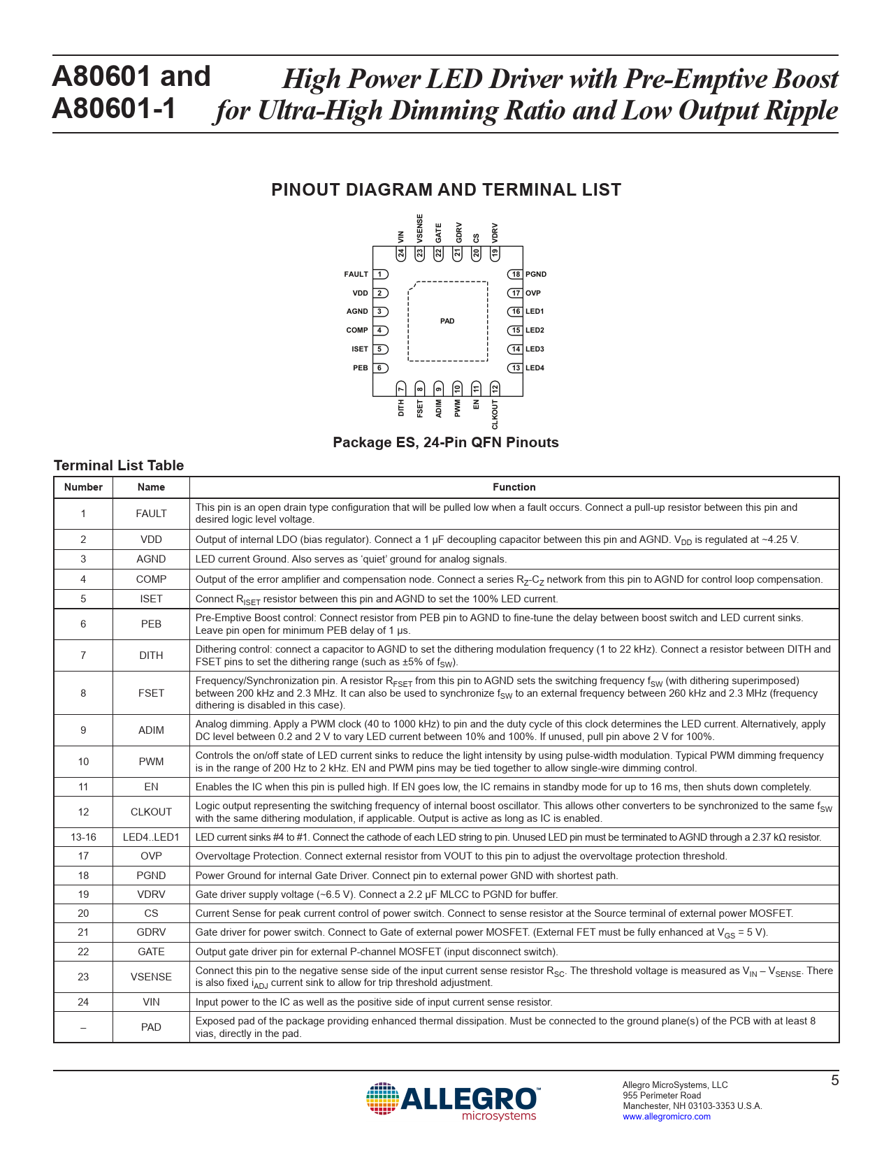 A80601 and High Power LED Driver with Pre-Emptive Boost A80601-1 for Ultra-High Dimming Ratio and Low Output Ripple PINOUT DIAGRAM AND TERMINAL LIST VIN VSENSE GATE GDRV CS VDRV 24 23 22 21 20 19 FAULT 1 18 PGND VDD 2 17 OVP AGND 3 16 LED1 PAD COMP 4 15 LED2 ISET 5 14 LED3 PEB 6 13 LED4 7 8 9 10 11 12 EN DITH FSET ADIM PWM CLKOUT Package ES, 24-Pin QFN Pinouts Terminal List Table Number Name Function