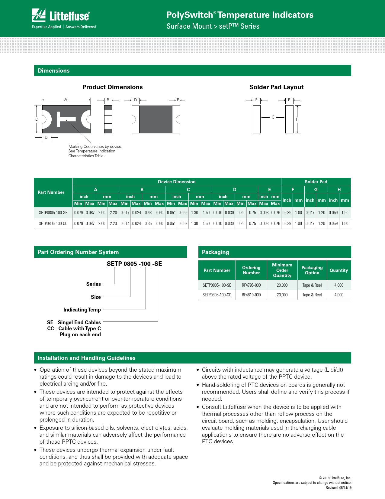 PolySwitch® Temperature Indicators. Dimensions. Product Dimensions. Solder Pad Layout. Device Dimension. Solder Pad. Part Number