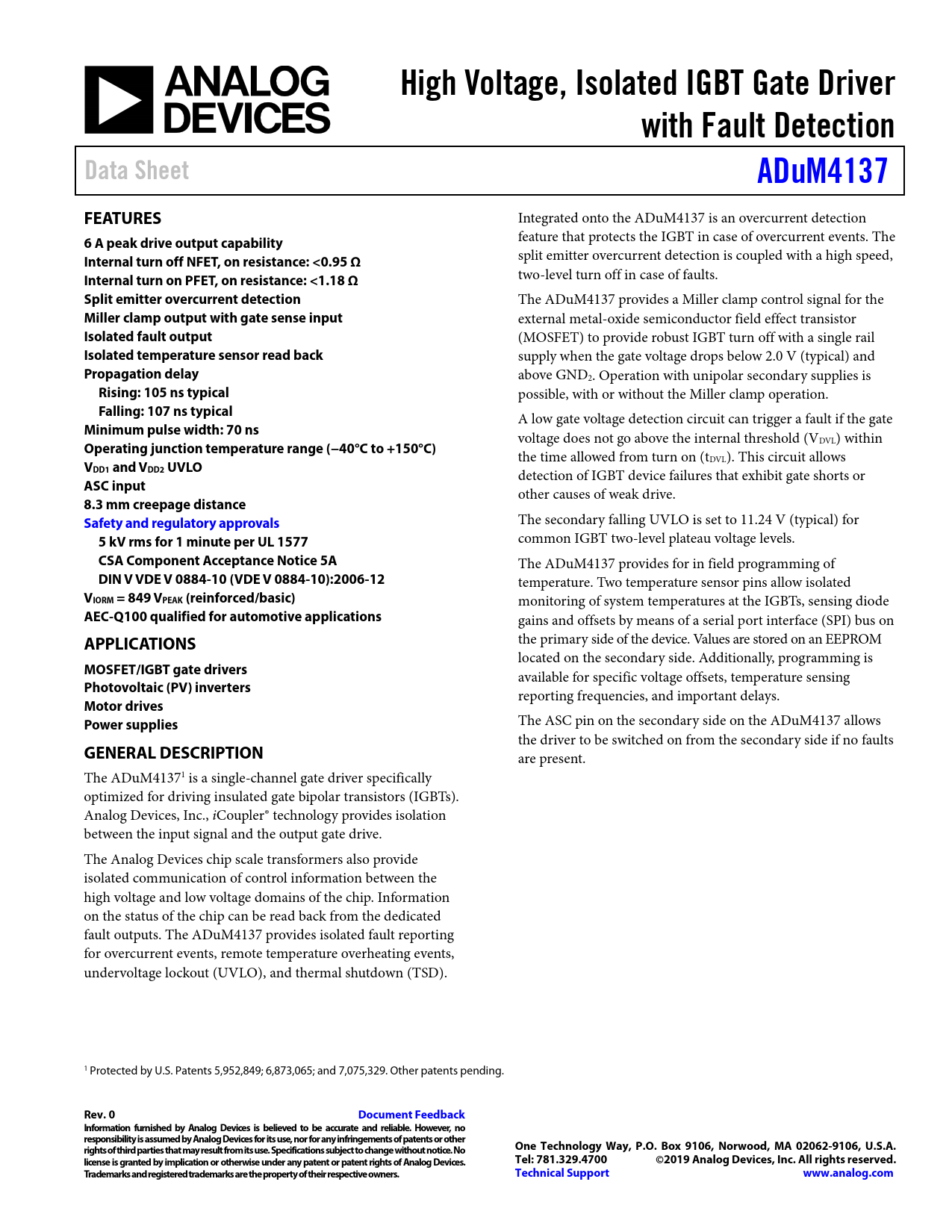 are present. The ADuM41371 is a single-channel gate driver specifically optimized for driving insulated gate bipolar transistors (IGBTs). Analog Devices, Inc., iCoupler® technology provides isolation between the input signal and the output gate drive. The Analog Devices chip scale transformers also provide isolated communication of control information between the high voltage and low voltage domains of the chip. Information on the status of the chip can be read back from the dedicated fault outputs. The ADuM4137 provides isolated fault reporting for overcurrent events, remote temperature overheating events, undervoltage lockout (UVLO), and thermal shutdown (TSD). 1 Protected by U.S. Patents 5,952,849; 6,873,065; and 7,075,329. Other patents pending.