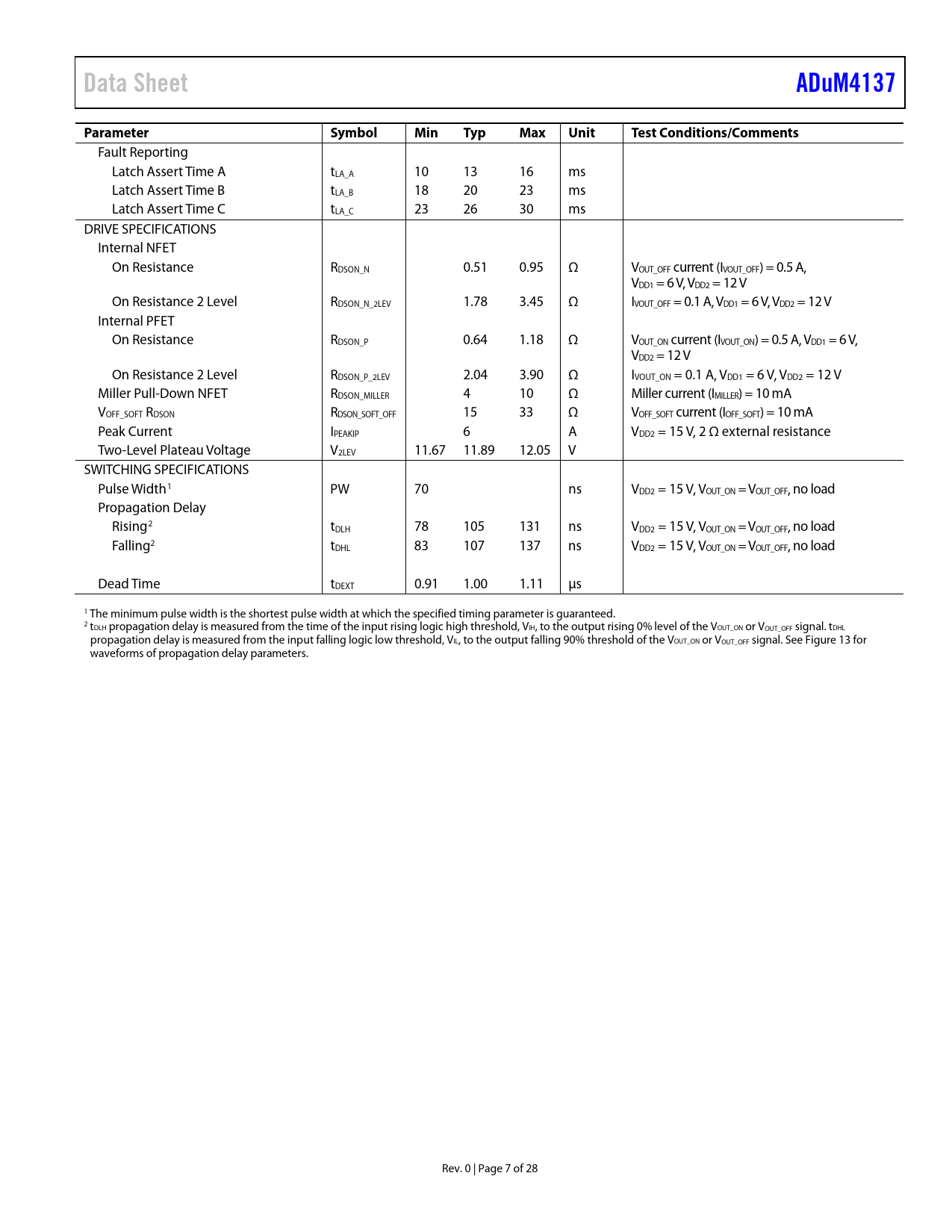 link to page 19 Data SheetADuM4137ParameterSymbolMinTypMaxUnitTest Conditions/Comments Fault Reporting Latch Assert Time A tLA_A 10 13 16 ms Latch Assert Time B tLA_B 18 20 23 ms Latch Assert Time C tLA_C 23 26 30 ms DRIVE SPECIFICATIONS Internal NFET On Resistance RDSON_N 0.51 0.95 Ω VOUT_OFF current (IVOUT_OFF) = 0.5 A, VDD1 = 6 V, VDD2 = 12 V On Resistance 2 Level RDSON_N_2LEV 1.78 3.45 Ω IVOUT_OFF = 0.1 A, VDD1 = 6 V, VDD2 = 12 V Internal PFET On Resistance RDSON_P 0.64 1.18 Ω VOUT_ON current (IVOUT_ON) = 0.5 A, VDD1 = 6 V, VDD2 = 12 V On Resistance 2 Level RDSON_P_2LEV 2.04 3.90 Ω IVOUT_ON = 0.1 A, VDD1 = 6 V, VDD2 = 12 V Miller Pull-Down NFET RDSON_MILLER 4 10 Ω Miller current (IMILLER) = 10 mA VOFF_SOFT RDSON RDSON_SOFT_OFF 15 33 Ω VOFF_SOFT current (IOFF_SOFT) = 10 mA Peak Current IPEAKIP 6 A VDD2 = 15 V, 2 Ω external resistance Two-Level Plateau Voltage V2LEV 11.67 11.89 12.05 V SWITCHING SPECIFICATIONS Pulse Width1 PW 70 ns VDD2 = 15 V, VOUT_ON = VOUT_OFF, no load Propagation Delay Rising2 tDLH 78 105 131 ns VDD2 = 15 V, VOUT_ON = VOUT_OFF, no load Falling2 tDHL 83 107 137 ns VDD2 = 15 V, VOUT_ON = VOUT_OFF, no load Dead Time tDEXT 0.91 1.00 1.11 µs 1 The minimum pulse width is the shortest pulse width at which the specified timing parameter is guaranteed. 2 tDLH propagation delay is measured from the time of the input rising logic high threshold, VIH, to the output rising 0% level of the VOUT_ON or VOUT_OFF signal. tDHL propagation delay is measured from the input falling logic low threshold, VIL, to the output falling 90% threshold of the VOUT_ON or VOUT_OFF signal. See Figure 13 for waveforms of propagation delay parameters. Rev. 0 | Page 7 of 28 Document Outline FEATURES APPLICATIONS GENERAL DESCRIPTION TABLE OF CONTENTS REVISION HISTORY FUNCTIONAL BLOCK DIAGRAM SPECIFICATIONS ELECTRICAL CHARACTERISTICS SPI TIMING SPECIFICATIONS SPI Timing Diagram PACKAGE CHARACTERISTICS REGULATORY INFORMATION INSULATION AND SAFETY RELATED SPECIFICATIONS DIN V VDE V 0884-10 (VDE V 0884-10) INSULATION CHARACTERISTICS RECOMMENDED OPERATING CONDITIONS ABSOLUTE MAXIMUM RATINGS THERMAL RESISTANCE ESD CAUTION PIN CONFIGURATION AND FUNCTION DESCRIPTIONS TYPICAL PERFORMANCE CHARACTERISTICS THEORY OF OPERATION APPLICATIONS INFORMATION PCB LAYOUT SPI AND EEPROM OPERATION SPI Programming USER REGISTER MAP USER REGISTER BITS OFFSET_2[5:0] Bits GAIN_2[5:0] Bits OFFSET_1[5:0] Bits GAIN_1[5:0] Bits CONFIGURATION REGISTER BITS OT_FAULT_OP Bit OT_FAULT_SEL Bit OC_TIME_OP Bit OC_2LEV_OP Bit LOW_T_OP Bit OC_BLANK_OP Bit tBLANK[3:0] Bits ECC_OFF_OP Bit T_RAMP_OP Bit PWM_OSC CONTROL REGISTER BITS ECC2_DBL_ERR Bit ECC2_SNG_ERR Bit ECC1_DBL_ERR Bit ECC1_SNG_ERR Bit PROG_BUSY Bit SIM_TRIM Bit SPI SAFETY PROPAGATION DELAY RELATED PARAMETERS PROTECTION FEATURES Primary Side UVLO Fault Reporting Overcurrent Detection High Speed, Two-Level Turn Off Miller Clamp Thermal Shutdown ASC Pin Functionality Isolated Temperature Sensor Low Temperature Operation Mode FAULTB Pin DRIVER_FAULTB Pin UVLO_FAULTB Pin VDD2 UVLO Fault UVLO_FAULTB Fault, Gate Low Dead Time Control DRIVER_FAULTB Fault, Dead Time Fault Power Dissipation INSULATION LIFETIME DC CORRECTNESS AND MAGNETIC FIELD IMMUNITY TYPICAL APPLICATION CIRCUIT OUTLINE DIMENSIONS ORDERING GUIDE AUTOMOTIVE PRODUCTS
