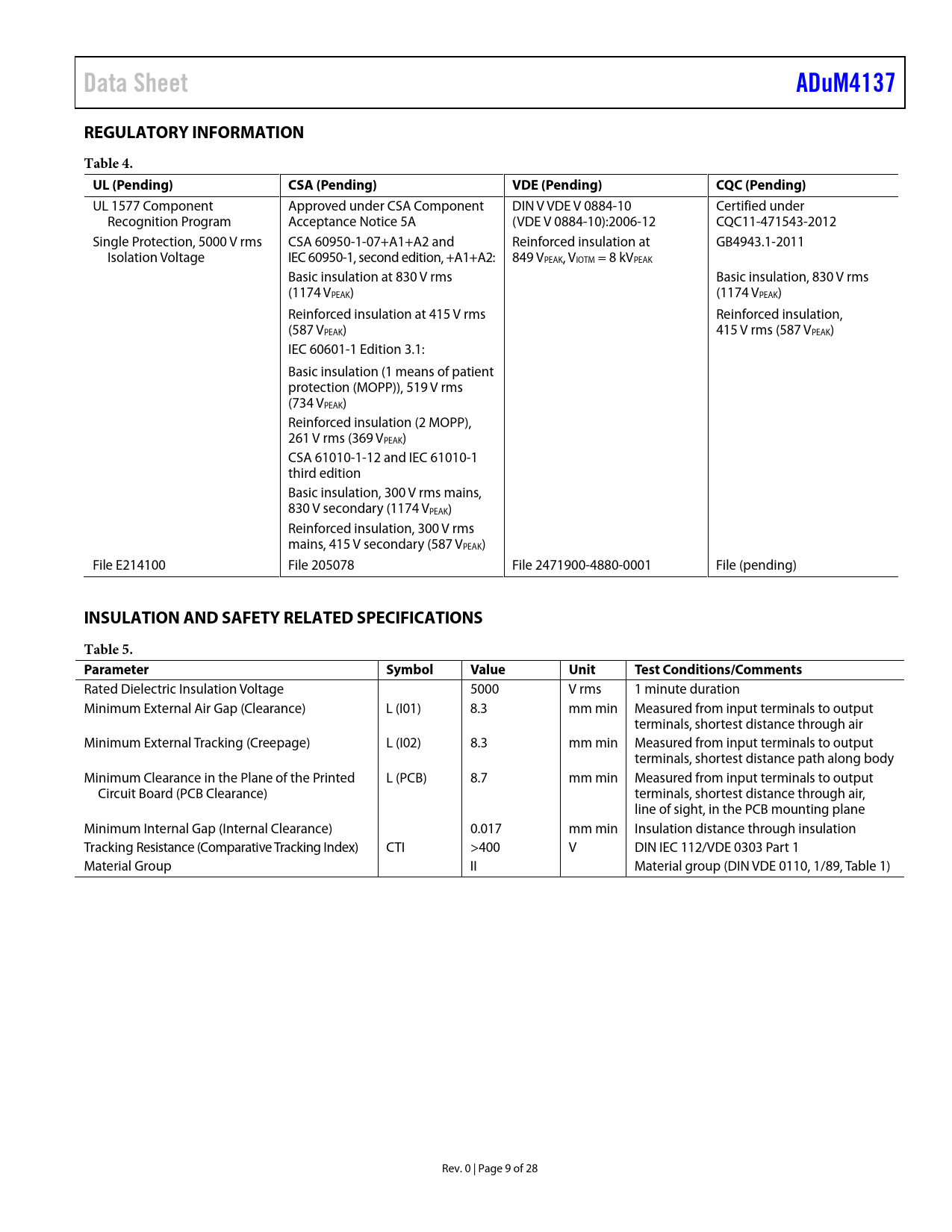 Data Sheet. ADuM4137. REGULATORY INFORMATION. Table 4. UL (Pending). CSA (Pending). VDE (Pending). CQC (Pending)