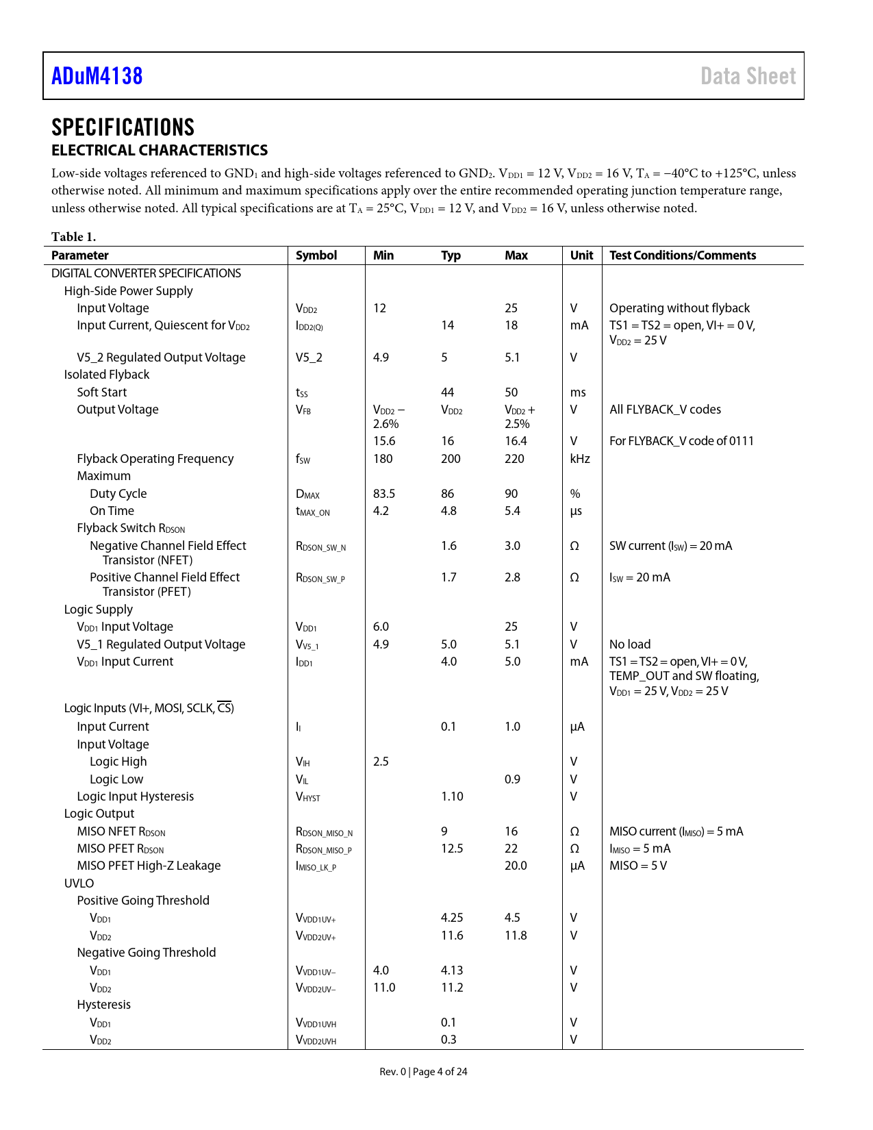 ADuM4138Data SheetSPECIFICATIONS ELECTRICAL CHARACTERISTICS Low-side voltages referenced to GND1 and high-side voltages referenced to GND2. VDD1 = 12 V, VDD2 = 16 V, TA = −40°C to +125°C, unless otherwise noted. All minimum and maximum specifications apply over the entire recommended operating junction temperature range, unless otherwise noted. All typical specifications are at TA = 25°C, VDD1 = 12 V, and VDD2 = 16 V, unless otherwise noted. Table 1. ParameterSymbolMinTypMaxUnit Test Conditions/Comments DIGITAL CONVERTER SPECIFICATIONS High-Side Power Supply Input Voltage VDD2 12 25 V Operating without flyback Input Current, Quiescent for VDD2 IDD2(Q) 14 18 mA TS1 = TS2 = open, VI+ = 0 V, VDD2 = 25 V V5_2 Regulated Output Voltage V5_2 4.9 5 5.1 V Isolated Flyback Soft Start tSS 44 50 ms Output Voltage VFB VDD2 − VDD2 VDD2 + V All FLYBACK_V codes 2.6% 2.5% 15.6 16 16.4 V For FLYBACK_V code of 0111 Flyback Operating Frequency fSW 180 200 220 kHz Maximum Duty Cycle DMAX 83.5 86 90 % On Time tMAX_ON 4.2 4.8 5.4 µs Flyback Switch RDSON Negative Channel Field Effect RDSON_SW_N 1.6 3.0 Ω SW current (ISW) = 20 mA Transistor (NFET) Positive Channel Field Effect RDSON_SW_P 1.7 2.8 Ω ISW = 20 mA Transistor (PFET) Logic Supply VDD1 Input Voltage VDD1 6.0 25 V V5_1 Regulated Output Voltage VV5_1 4.9 5.0 5.1 V No load VDD1 Input Current IDD1 4.0 5.0 mA TS1 = TS2 = open, VI+ = 0 V, TEMP_OUT and SW floating, VDD1 = 25 V, VDD2 = 25 V Logic Inputs (VI+, MOSI, SCLK, CS) Input Current II 0.1 1.0 µA Input Voltage Logic High VIH 2.5 V Logic Low VIL 0.9 V Logic Input Hysteresis VHYST 1.10 V Logic Output MISO NFET RDSON RDSON_MISO_N 9 16 Ω MISO current (IMISO) = 5 mA MISO PFET RDSON RDSON_MISO_P 12.5 22 Ω IMISO = 5 mA MISO PFET High-Z Leakage IMISO_LK_P 20.0 µA MISO = 5 V UVLO Positive Going Threshold VDD1 VVDD1UV+ 4.25 4.5 V VDD2 VVDD2UV+ 11.6 11.8 V Negative Going Threshold VDD1 VVDD1UV− 4.0 4.13 V VDD2 VVDD2UV− 11.0 11.2 V Hysteresis VDD1 VVDD1UVH 0.1 V VDD2 VVDD2UVH 0.3 V Rev. 0 | Page 4 of 24 Document Outline FEATURES APPLICATIONS GENERAL DESCRIPTION TABLE OF CONTENTS REVISION HISTORY FUNCTIONAL BLOCK DIAGRAM SPECIFICATIONS ELECTRICAL CHARACTERISTICS SPI TIMING SPECIFICATIONS SPI Timing Diagram PACKAGE CHARACTERISTICS REGULATORY INFORMATION (PENDING) INSULATION AND SAFETY-RELATED SPECIFICATIONS DIN V VDE V 0884-10 (VDE V 0884-10):2016-12 INSULATION CHARACTERISTICS (PENDING) RECOMMENDED OPERATING CONDITIONS ABSOLUTE MAXIMUM RATINGS THERMAL RESISTANCE ESD CAUTION PIN CONFIGURATION AND FUNCTION DESCRIPTIONS TYPICAL PERFORMANCE CHARACTERISTICS THEORY OF OPERATION APPLICATIONS INFORMATION PCB LAYOUT ISOLATED FLYBACK CONTROLLER SPI AND EEPROM OPERATION SPI Programming USER REGISTER MAP USER REGISTER BITS OFFSET_2[5:0] Bits GAIN_2[5:0] Bits OFFSET_1[5:0] Bits GAIN_1[5:0] Bits CONFIGURATION REGISTER BITS OT_FAULT_OP Bit OT_FAULT_SEL Bit OC_TIME_OP Bit OC_2LEV_OP Bits LOW_T_OP Bit OC_BLANK_OP Bit tBLANK[3:0] Bits ECC_OFF_OP Bit FLYBACK_V[3:0] Bits T_RAMP_OP Bit PWM_OSC Bit CONTROL REGISTER BITS ECC2_DBL_ERR Bit ECC2_SNG_ERR Bit ECC1_DBL_ERR Bit ECC1_SNG_ERR Bit PROG_BUSY Bit SIM_TRIM Bit PROPAGATION DELAY RELATED PARAMETERS PROTECTION FEATURES Primary Side UVLO Fault Reporting Overcurrent Detection High Speed, Two-Level, Turn Off Miller Clamp Desaturation Detection Thermal Shutdown Isolated Temperature Sensor POWER DISSIPATION INSULATION LIFETIME DC CORRECTNESS AND MAGNETIC FIELD IMMUNITY TYPICAL APPLICATION CIRCUIT OUTLINE DIMENSIONS ORDERING GUIDE AUTOMOTIVE PRODUCTS