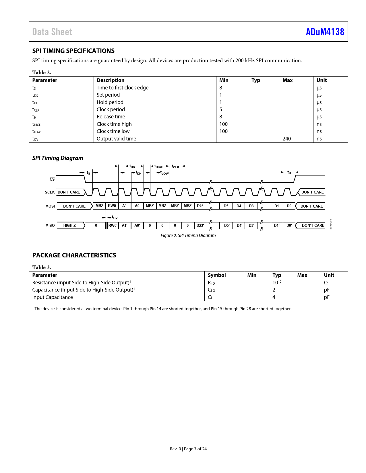 Data SheetADuM4138SPI TIMING SPECIFICATIONS SPI timing specifications are guaranteed by design. All devices are production tested with 200 kHz SPI communication. Table 2. Parameter DescriptionMinTypMaxUnit tS Time to first clock edge 8 μs tDS Set period 1 μs tDH Hold period 1 μs tCLK Clock period 5 μs tH Release time 8 μs tHIGH Clock time high 100 ns tLOW Clock time low 100 ns tOV Output valid time 240 ns SPI Timing DiagramtDStHIGHtCLKtttSDHtLOWHCSSCLK DON’T CAREDON’T CAREMOSIDON’T CAREMBZRW0A1A0MBZMBZMBZMBZD23D5D4D3D1D0DON’T CAREtOV 4 -00 MISOHIGH-Z0RW0′A1′A0′0000D23′D5′D4′D3′D1′D0′DON’T CARE 6 03 16 Figure 2. SPI Timing Diagram PACKAGE CHARACTERISTICSTable 3. ParameterSymbolMinTypMaxUnit Resistance (Input Side to High-Side Output)1 RI-O 1012 Ω Capacitance (Input Side to High-Side Output)1 CI-O 2 pF Input Capacitance CI 4 pF 1 The device is considered a two terminal device: Pin 1 through Pin 14 are shorted together, and Pin 15 through Pin 28 are shorted together. Rev. 0 | Page 7 of 24 Document Outline FEATURES APPLICATIONS GENERAL DESCRIPTION TABLE OF CONTENTS REVISION HISTORY FUNCTIONAL BLOCK DIAGRAM SPECIFICATIONS ELECTRICAL CHARACTERISTICS SPI TIMING SPECIFICATIONS SPI Timing Diagram PACKAGE CHARACTERISTICS REGULATORY INFORMATION (PENDING) INSULATION AND SAFETY-RELATED SPECIFICATIONS DIN V VDE V 0884-10 (VDE V 0884-10):2016-12 INSULATION CHARACTERISTICS (PENDING) RECOMMENDED OPERATING CONDITIONS ABSOLUTE MAXIMUM RATINGS THERMAL RESISTANCE ESD CAUTION PIN CONFIGURATION AND FUNCTION DESCRIPTIONS TYPICAL PERFORMANCE CHARACTERISTICS THEORY OF OPERATION APPLICATIONS INFORMATION PCB LAYOUT ISOLATED FLYBACK CONTROLLER SPI AND EEPROM OPERATION SPI Programming USER REGISTER MAP USER REGISTER BITS OFFSET_2[5:0] Bits GAIN_2[5:0] Bits OFFSET_1[5:0] Bits GAIN_1[5:0] Bits CONFIGURATION REGISTER BITS OT_FAULT_OP Bit OT_FAULT_SEL Bit OC_TIME_OP Bit OC_2LEV_OP Bits LOW_T_OP Bit OC_BLANK_OP Bit tBLANK[3:0] Bits ECC_OFF_OP Bit FLYBACK_V[3:0] Bits T_RAMP_OP Bit PWM_OSC Bit CONTROL REGISTER BITS ECC2_DBL_ERR Bit ECC2_SNG_ERR Bit ECC1_DBL_ERR Bit ECC1_SNG_ERR Bit PROG_BUSY Bit SIM_TRIM Bit PROPAGATION DELAY RELATED PARAMETERS PROTECTION FEATURES Primary Side UVLO Fault Reporting Overcurrent Detection High Speed, Two-Level, Turn Off Miller Clamp Desaturation Detection Thermal Shutdown Isolated Temperature Sensor POWER DISSIPATION INSULATION LIFETIME DC CORRECTNESS AND MAGNETIC FIELD IMMUNITY TYPICAL APPLICATION CIRCUIT OUTLINE DIMENSIONS ORDERING GUIDE AUTOMOTIVE PRODUCTS