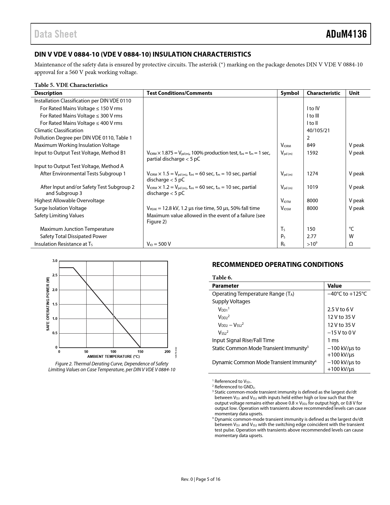 link to page 5 Data SheetADuM4136DIN V VDE V 0884-10 (VDE V 0884-10) INSULATION CHARACTERISTICS Maintenance of the safety data is ensured by protective circuits. The asterisk (*) marking on the package denotes DIN V VDE V 0884-10 approval for a 560 V peak working voltage. Table 5. VDE Characteristics Description TestConditions/CommentsSymbolCharacteristicUnit Installation Classification per DIN VDE 0110 For Rated Mains Voltage ≤ 150 V rms I to IV For Rated Mains Voltage ≤ 300 V rms I to III For Rated Mains Voltage ≤ 400 V rms I to II Climatic Classification 40/105/21 Pollution Degree per DIN VDE 0110, Table 1 2 Maximum Working Insulation Voltage VIORM 849 V peak Input to Output Test Voltage, Method B1 VIORM × 1.875 = Vpd (m), 100% production test, tini = tm = 1 sec, Vpd (m) 1592 V peak partial discharge < 5 pC Input to Output Test Voltage, Method A After Environmental Tests Subgroup 1 VIORM × 1.5 = Vpd (m), tini = 60 sec, tm = 10 sec, partial Vpd (m) 1274 V peak discharge < 5 pC After Input and/or Safety Test Subgroup 2 VIORM × 1.2 = Vpd (m), tini = 60 sec, tm = 10 sec, partial Vpd (m) 1019 V peak and Subgroup 3 discharge < 5 pC Highest Allowable Overvoltage VIOTM 8000 V peak Surge Isolation Voltage VPEAK = 12.8 kV, 1.2 μs rise time, 50 μs, 50% fall time VIOSM 8000 V peak Safety Limiting Values Maximum value allowed in the event of a failure (see Figure 2) Maximum Junction Temperature TS 150 °C Safety Total Dissipated Power PS 2.77 W Insulation Resistance at TS VIO = 500 V RS >109 Ω 3.0RECOMMENDED OPERATING CONDITIONS) 2.5Table 6.(W R EParameterValueW 2.0 Operating Temperature Range (TA) −40°C to +125°C PO G IN Supply Voltages 1.5T A V 1 DD1 2.5 V to 6 V PER V 2 12 V to 35 V O 1.0 DD2 E F V 2 DD2 − VSS2 12 V to 35 V SA 0.5 V 2 SS2 −15 V to 0 V Input Signal Rise/Fall Time 1 ms 0 02 Static Common Mode Transient Immunity3 −100 kV/μs to 050100150200 -0 AMBIENT TEMPERATURE (°C) 575 +100 kV/μs 13 Figure 2. Thermal Derating Curve, Dependence of Safety Dynamic Common Mode Transient Immunity4 −100 kV/μs to Limiting Values on Case Temperature, per DIN V VDE V 0884-10 +100 kV/μs 1 Referenced to VSS1. 2 Referenced to GND2. 3 Static common-mode transient immunity is defined as the largest dv/dt between VSS1 and VSS2 with inputs held either high or low such that the output voltage remains either above 0.8 × VDD2 for output high, or 0.8 V for output low. Operation with transients above recommended levels can cause momentary data upsets. 4 Dynamic common-mode transient immunity is defined as the largest dv/dt between VSS1 and VSS2 with the switching edge coincident with the transient test pulse. Operation with transients above recommended levels can cause momentary data upsets. Rev. 0 | Page 5 of 16 Document Outline Features Applications General Description Functional Block Diagram Revision History Specifications Electrical Characteristics Package Characteristics Regulatory Information Insulation and Safety Related Specifications DIN V VDE V 0884-10 (VDE V 0884-10) Insulation Characteristics Recommended Operating Conditions Absolute Maximum Ratings ESD Caution Pin Configuration and Function Descriptions Typical Performanace Characteristics Applications Information PCB Layout Propagation Delay Related Parameters Protection Features Fault Reporting Desaturation Detection Thermal Shutdown Undervoltage Lockout (UVLO) Faults READY Pin Pin Pin VI+ and VI− Operation Gate Resistance Selection Power Dissipation DC Correctness and Magnetic Field Immunity Insulation Lifetime Surface Tracking Insulation Wear Out Calculation and Use of Parameters Example Typical Application Outline Dimensions Ordering Guide