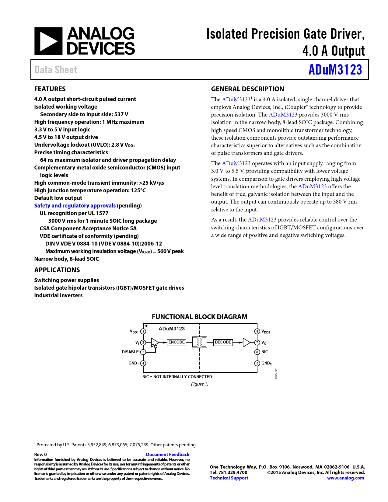 | Pages / Page | 15 / 1 — Isolated Precision Gate Driver,. 4.0 A Output. Data Sheet. ADuM3123. … |