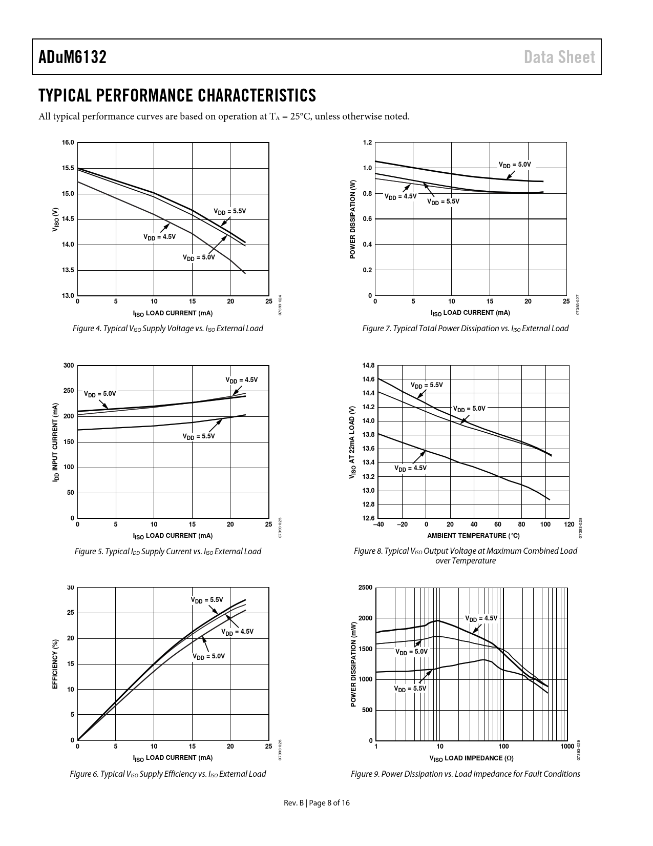 ADuM6132Data SheetTYPICAL PERFORMANCE CHARACTERISTICS All typical performance curves are based on operation at TA = 25°C, unless otherwise noted. 16.01.2V15.51.0DD = 5.0V)(W15.00.8VDD = 4.5VVTIONDD = 5.5VVADD = 5.5V(V)IP14.5S0.6ISOISVDVDD = 4.5VR14.00.4OWEVDD = 5.0VP13.50.213.000510152025 024 0510152025 027 I 07393- ISO LOAD CURRENT (mA)I 07393- ISO LOAD CURRENT (mA) Figure 4. Typical VISO Supply Voltage vs. IISO External Load Figure 7. Typical Total Power Dissipation vs. IISO External Load 30014.8V14.6DD = 4.5VVDD = 5.5V250VDD = 5.0V14.4)14.2VmA)VDD = 5.0V(20014.0NTAD ( OV13.8DD = 5.5V150CURRE13.622mA LUTAT13.4NP100IVDD = 4.5VISOV 13.2I DD5013.012.8012.60510152025 025 –40–20 028 020406080100120I 07393- ISO LOAD CURRENT (mA)AMBIENT TEMPERATURE (°C) 07393- Figure 5. Typical IDD Supply Current vs. IISO External Load Figure 8. Typical VISO Output Voltage at Maximum Combined Load over Temperature 302500VDD = 5.5V252000V)DD = 4.5VWVDD = 4.5V20(m%)N(IO 1500TVVDD = 5.0VDD = 5.0VNCYPAE15ICIISSIFD 1000F E10ERVDD = 5.5VWPO5005000510152025 026 1101001000 029 I 07393- ISO LOAD CURRENT (mA)V 07393- ISO LOAD IMPEDANCE (Ω) Figure 6. Typical VISO Supply Efficiency vs. IISO External Load Figure 9. Power Dissipation vs. Load Impedance for Fault Conditions Rev. B | Page 8 of 16 Document Outline Features Applications General Description Functional Block Diagram Table of Contents Revision History Specifications Electrical Characteristics Package Characteristics Regulatory Information Insulation and Safety-Related Specifications DIN V VDE V 0884-10 (VDE V 0884-10) Insulation Characteristics Recommended Operation Conditions Absolute Maximum Values ESD Caution Pin Configuration and Function Descriptions Typical Performance Characteristics Terminology Applications Information Typical Application Usage PCB Layout Thermal Analysis Undervoltage Lockout Propagation Delay-Related Parameters Magnetic Field Immunity Insulation Lifetime Outline Dimensions Ordering Guide