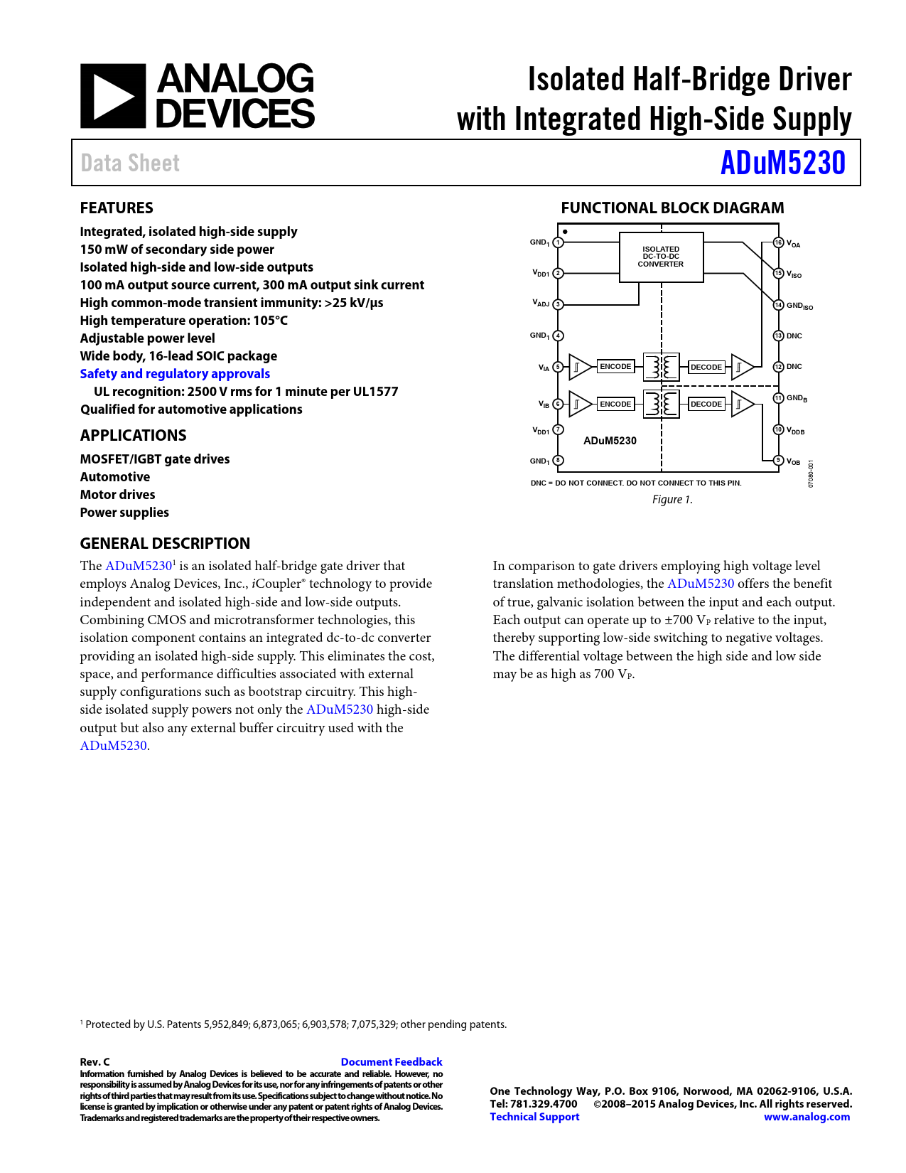 Isolated Half-Bridge Driver. with Integrated High-Side Supply. Data Sheet. ADuM5230. FEATURES. FUNCTIONAL BLOCK DIAGRAM