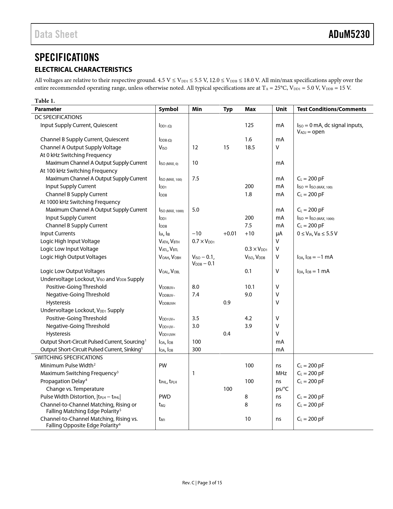 Pages / Page15 / 3 — Data Sheet. ADuM5230. SPECIFICATIONS ELECTRICAL CHARACTERISTICS. Table 1. …