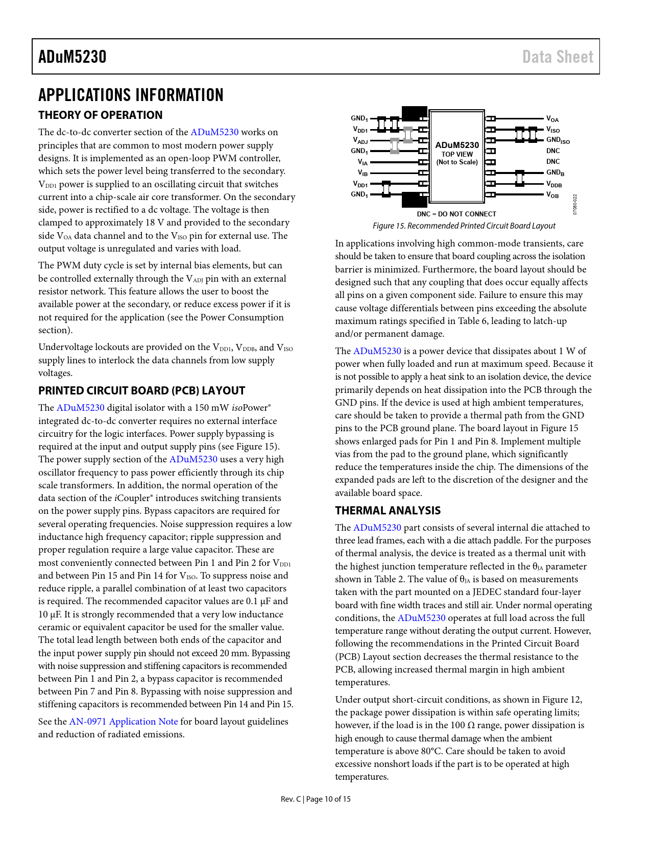 link to page 12 link to page 10 link to page 6 link to page 10 link to page 5 link to page 10 link to page 10 link to page 9 ADuM5230Data SheetAPPLICATIONS INFORMATION THEORY OF OPERATIONGND1VOA The dc-to-dc converter section of the ADuM5230 works on VDD1VISOVGND principles that are common to most modern power supply ADJISOADuM5230GND1DNC designs. It is implemented as an open-loop PWM controller, TOP VIEWVIA(Not to Scale)DNC which sets the power level being transferred to the secondary. VIBGNDB V V DD1 power is supplied to an oscillating circuit that switches DD1VDDB current into a chip-scale air core transformer. On the secondary GND1VOB 022 0- side, power is rectified to a dc voltage. The voltage is then 0708 DNC = DO NOT CONNECT clamped to approximately 18 V and provided to the secondary Figure 15. Recommended Printed Circuit Board Layout side VOA data channel and to the VISO pin for external use. The output voltage is unregulated and varies with load. In applications involving high common-mode transients, care should be taken to ensure that board coupling across the isolation The PWM duty cycle is set by internal bias elements, but can barrier is minimized. Furthermore, the board layout should be be controlled externally through the VADJ pin with an external designed such that any coupling that does occur equally affects resistor network. This feature allows the user to boost the all pins on a given component side. Failure to ensure this may available power at the secondary, or reduce excess power if it is cause voltage differentials between pins exceeding the absolute not required for the application (see the Power Consumption maximum ratings specified in Table 6, leading to latch-up section). and/or permanent damage. Undervoltage lockouts are provided on the VDD1, VDDB, and VISO The ADuM5230 is a power device that dissipates about 1 W of supply lines to interlock the data channels from low supply power when fully loaded and run at maximum speed. Because it voltages. is not possible to apply a heat sink to an isolation device, the device PRINTED CIRCUIT BOARD (PCB) LAYOUT primarily depends on heat dissipation into the PCB through the GND pins. If the device is used at high ambient temperatures, The ADuM5230 digital isolator with a 150 mW isoPower® care should be taken to provide a thermal path from the GND integrated dc-to-dc converter requires no external interface pins to the PCB ground plane. The board layout in Figure 15 circuitry for the logic interfaces. Power supply bypassing is shows enlarged pads for Pin 1 and Pin 8. Implement multiple required at the input and output supply pins (see Figure 15). vias from the pad to the ground plane, which significantly The power supply section of the ADuM5230 uses a very high reduce the temperatures inside the chip. The dimensions of the oscillator frequency to pass power efficiently through its chip expanded pads are left to the discretion of the designer and the scale transformers. In addition, the normal operation of the available board space. data section of the iCoupler® introduces switching transients on the power supply pins. Bypass capacitors are required for THERMAL ANALYSIS several operating frequencies. Noise suppression requires a low The ADuM5230 part consists of several internal die attached to inductance high frequency capacitor; ripple suppression and three lead frames, each with a die attach paddle. For the purposes proper regulation require a large value capacitor. These are of thermal analysis, the device is treated as a thermal unit with most conveniently connected between Pin 1 and Pin 2 for VDD1 the highest junction temperature reflected in the θJA parameter and between Pin 15 and Pin 14 for VISO. To suppress noise and shown in Table 2. The value of θJA is based on measurements reduce ripple, a parallel combination of at least two capacitors taken with the part mounted on a JEDEC standard four-layer is required. The recommended capacitor values are 0.1 μF and board with fine width traces and still air. Under normal operating 10 μF. It is strongly recommended that a very low inductance conditions, the ADuM5230 operates at full load across the full ceramic or equivalent capacitor be used for the smaller value. temperature range without derating the output current. However, The total lead length between both ends of the capacitor and following the recommendations in the Printed Circuit Board the input power supply pin should not exceed 20 mm. Bypassing (PCB) Layout section decreases the thermal resistance to the with noise suppression and stiffening capacitors is recommended PCB, allowing increased thermal margin in high ambient between Pin 1 and Pin 2, a bypass capacitor is recommended temperatures. between Pin 7 and Pin 8. Bypassing with noise suppression and stiffening capacitors is recommended between Pin 14 and Pin 15. Under output short-circuit conditions, as shown in Figure 12, the package power dissipation is within safe operating limits; See the AN-0971 Application Note for board layout guidelines however, if the load is in the 100 Ω range, power dissipation is and reduction of radiated emissions. high enough to cause thermal damage when the ambient temperature is above 80°C. Care should be taken to avoid excessive nonshort loads if the part is to be operated at high temperatures. Rev. C | Page 10 of 15 Document Outline FEATURES APPLICATIONS FUNCTIONAL BLOCK DIAGRAM GENERAL DESCRIPTION TABLE OF CONTENTS REVISION HISTORY SPECIFICATIONS ELECTRICAL CHARACTERISTICS PACKAGE CHARACTERISTICS REGULATORY INFORMATION INSULATION AND SAFETY-RELATED SPECIFICATIONS RECOMMENDED OPERATING CONDITIONS ABSOLUTE MAXIMUM RATINGS ESD CAUTION PIN CONFIGURATION AND FUNCTION DESCRIPTIONS TYPICAL PERFOMANCE CHARACTERISTICS APPLICATIONS INFORMATION THEORY OF OPERATION PRINTED CIRCUIT BOARD (PCB) LAYOUT THERMAL ANALYSIS PROPAGATION DELAY-RELATED PARAMETERS DC CORRECTNESS AND MAGNETIC FIELD IMMUNITY POWER CONSUMPTION INCREASING AND