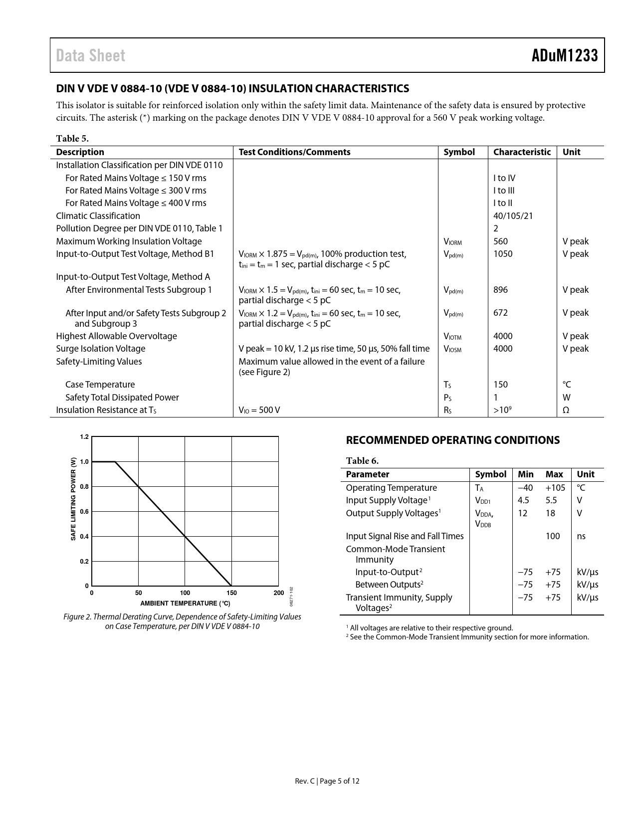 link to page 5 link to page 9 link to page 5 link to page 5 link to page 5 Data SheetADuM1233DIN V VDE V 0884-10 (VDE V 0884-10) INSULATION CHARACTERISTICS This isolator is suitable for reinforced isolation only within the safety limit data. Maintenance of the safety data is ensured by protective circuits. The asterisk (*) marking on the package denotes DIN V VDE V 0884-10 approval for a 560 V peak working voltage. Table 5. DescriptionTest Conditions/CommentsSymbolCharacteristic Unit Installation Classification per DIN VDE 0110 For Rated Mains Voltage ≤ 150 V rms I to IV For Rated Mains Voltage ≤ 300 V rms I to III For Rated Mains Voltage ≤ 400 V rms I to II Climatic Classification 40/105/21 Pollution Degree per DIN VDE 0110, Table 1 2 Maximum Working Insulation Voltage VIORM 560 V peak Input-to-Output Test Voltage, Method B1 VIORM × 1.875 = Vpd(m), 100% production test, Vpd(m) 1050 V peak tini = tm = 1 sec, partial discharge < 5 pC Input-to-Output Test Voltage, Method A After Environmental Tests Subgroup 1 VIORM × 1.5 = Vpd(m), tini = 60 sec, tm = 10 sec, Vpd(m) 896 V peak partial discharge < 5 pC After Input and/or Safety Tests Subgroup 2 VIORM × 1.2 = Vpd(m), tini = 60 sec, tm = 10 sec, Vpd(m) 672 V peak and Subgroup 3 partial discharge < 5 pC Highest Allowable Overvoltage VIOTM 4000 V peak Surge Isolation Voltage V peak = 10 kV, 1.2 µs rise time, 50 µs, 50% fal time VIOSM 4000 V peak Safety-Limiting Values Maximum value allowed in the event of a failure (see Figure 2) Case Temperature TS 150 °C Safety Total Dissipated Power PS 1 W Insulation Resistance at TS VIO = 500 V RS >109 Ω 1.2RECOMMENDED OPERATING CONDITIONS1.0W)Table 6.( RParameterSymbol Min MaxUnitOWE 0.8 Operating Temperature TA −40 +105 °C G P Input Supply Voltage1 VDD1 4.5 5.5 V ITIN 0.6 Output Supply Voltages1 VDDA, 12 18 V LIM VDDB FE A 0.4 Input Signal Rise and Fall Times 100 ns S Common-Mode Transient 0.2 Immunity Input-to-Output2 −75 +75 kV/µs 0 Between Outputs2 −75 +75 kV/µs 050100150200 102 Transient Immunity, Supply −75 +75 kV/µs AMBIENT TEMPERATURE (°C) 06271- Voltages2 Figure 2. Thermal Derating Curve, Dependence of Safety-Limiting Values on Case Temperature, per DIN V VDE V 0884-10 1 All voltages are relative to their respective ground. 2 See the Common-Mode Transient Immunity section for more information. Rev. C | Page 5 of 12 Document Outline Features Applications General Description Functional Block Diagram Table of Contents Revision History Specifications Electrical Characteristics Package Characteristics Regulatory Information Insulation and Safety-Related Specifications DIN V VDE V 0884-10 (VDE V 0884-10) Insulation Characteristics Recommended Operating Conditions Absolute Maximum Ratings ESD Caution Pin Configuration and Function Descriptions Typical Perfomance Characteristics Applications Information Common-Mode Transient Immunity Outline Dimensions Ordering Guide
