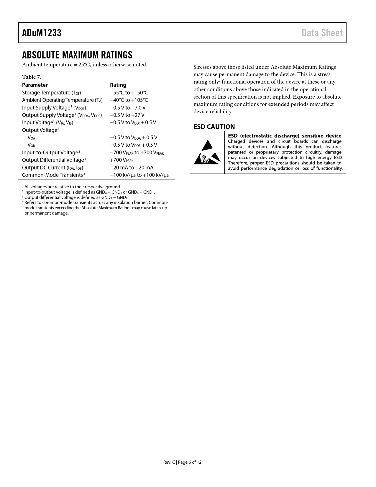ADuM1233. Data Sheet. ABSOLUTE MAXIMUM RATINGS. Table 7. Parameter. Rating. ESD CAUTION