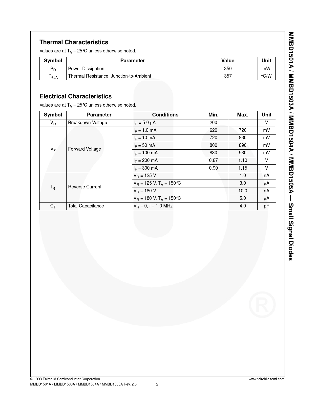 2 MMBD1501A / MMBD1503A / MMBD1504A / MMBD1505A — Small Signal Diodes Thermal Characteristics