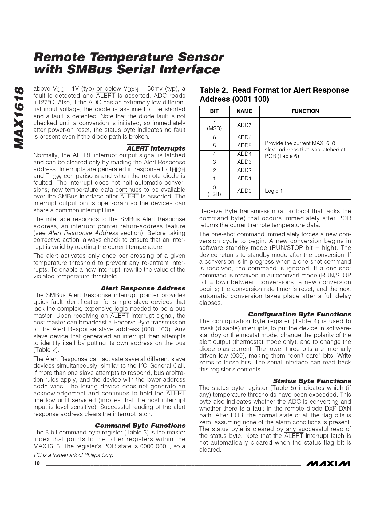 The status byte is cleared by any successful read of The 8-bit command byte register (Table 3) is the master the status byte. Note that the ALERT interrupt latch is index that points to the other registers within the not automatically cleared when the status flag bit is MAX1618. The register’s POR state is 0000 0001, so a cleared. I2C is a trademark of Philips Corp.