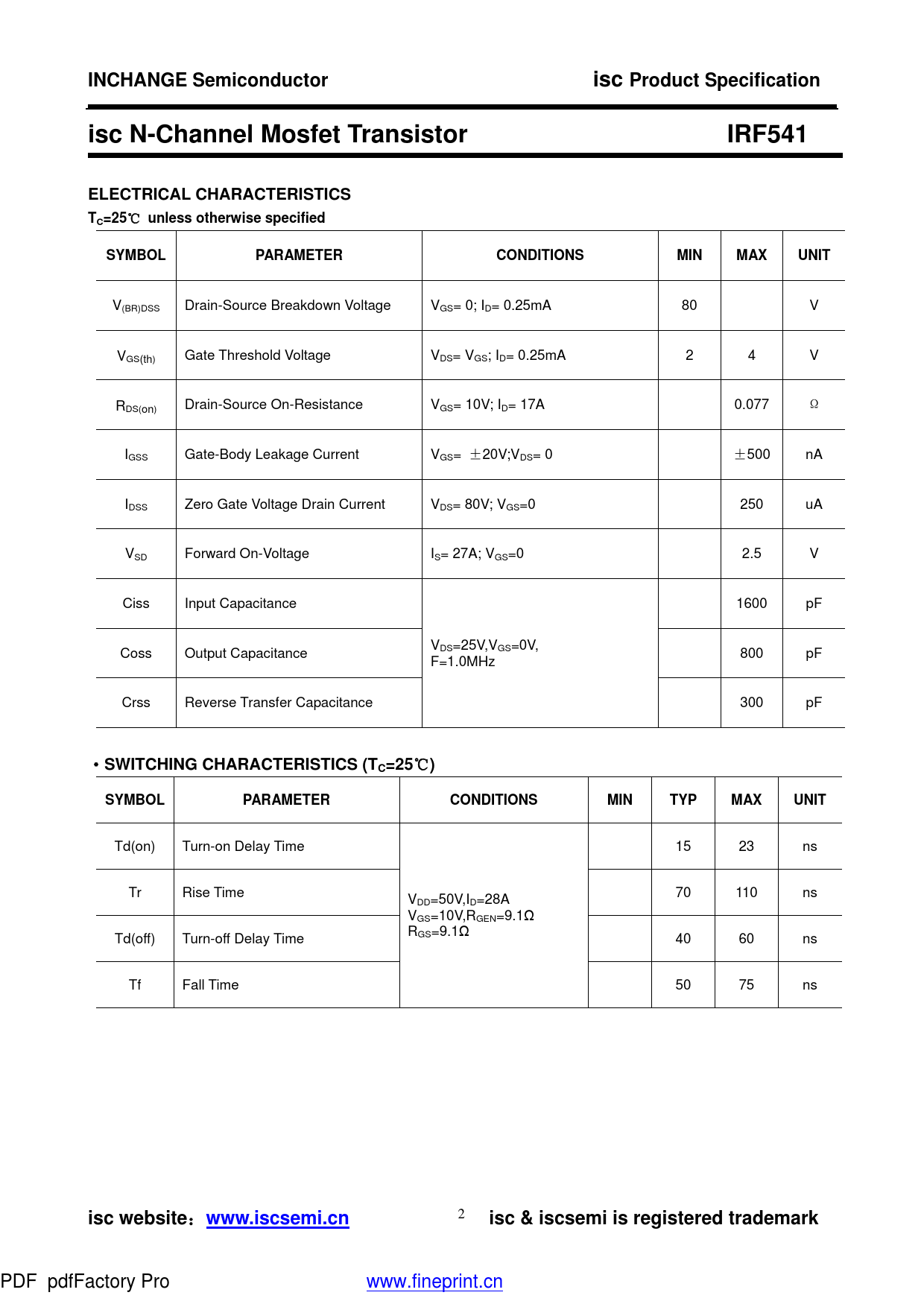 INCHANGE Semiconductor. isc Product Specification. isc N-Channel Mosfet Transistor IRF541. ELECTRICAL CHARACTERISTICS