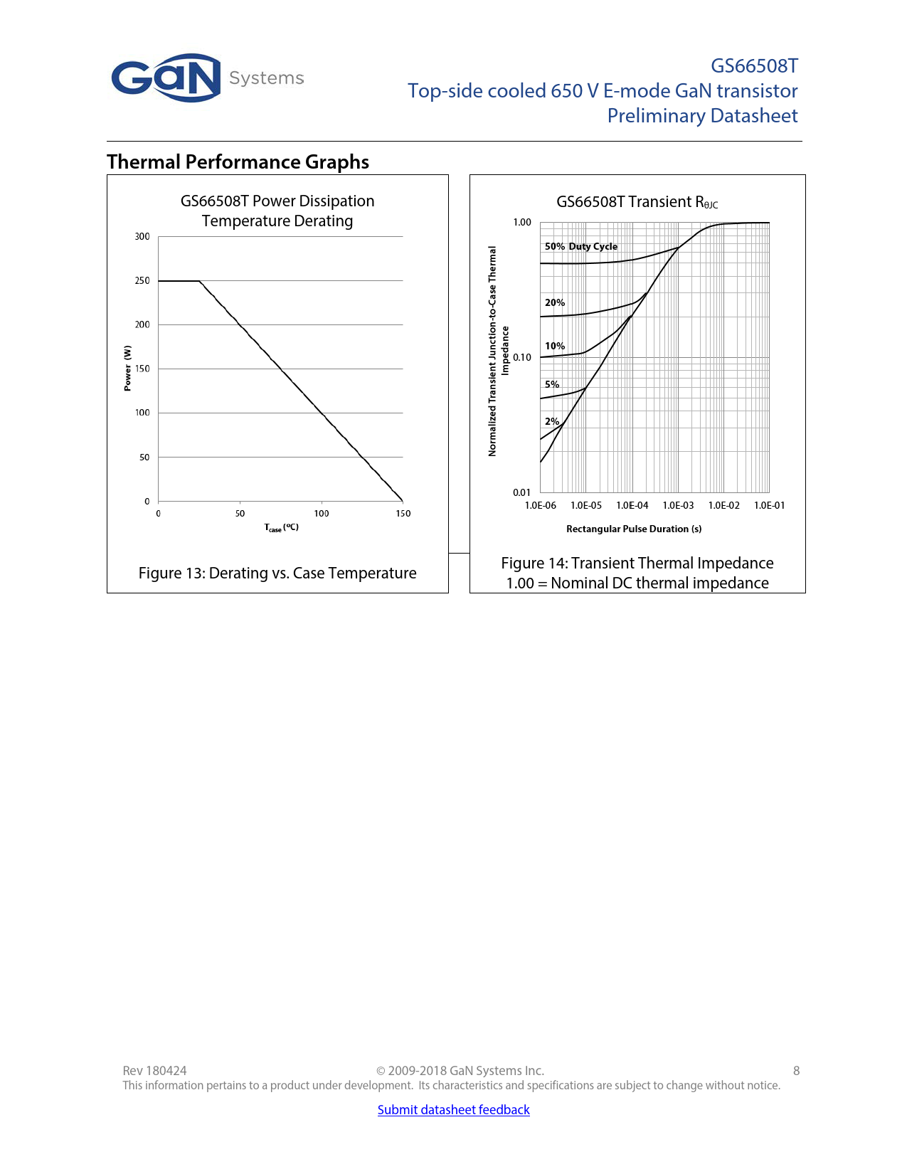 GS66508T Power Dissipation GS66508T Transient RθJC Temperature Derating Figure 14: Transient Thermal Impedance Figure 13: Derating vs. Case Temperature 1.00 = Nominal DC thermal impedance Rev 180424 © 2009-2018 GaN Systems Inc. 8 This information pertains to a product under development. Its characteristics and specifications are subject to change without notice. Submit datasheet feedback