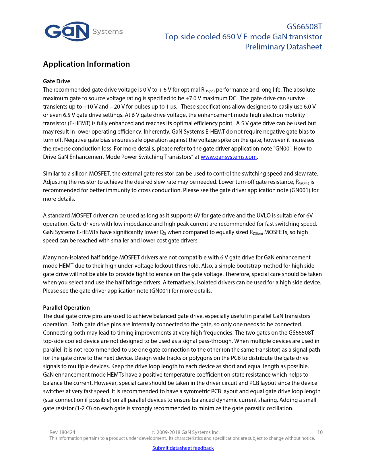 The dual gate drive pins are used to achieve balanced gate drive, especially useful in parallel GaN transistors operation. Both gate drive pins are internally connected to the gate, so only one needs to be connected. Connecting both may lead to timing improvements at very high frequencies. The two gates on the GS66508T top-side cooled device are not designed to be used as a signal pass-through. When multiple devices are used in parallel, it is not recommended to use one gate connection to the other (on the same transistor) as a signal path for the gate drive to the next device. Design wide tracks or polygons on the PCB to distribute the gate drive signals to multiple devices. Keep the drive loop length to each device as short and equal length as possible. GaN enhancement mode HEMTs have a positive temperature coefficient on-state resistance which helps to balance the current. However, special care should be taken in the driver circuit and PCB layout since the device switches at very fast speed. It is recommended to have a symmetric PCB layout and equal gate drive loop length (star connection if possible) on all parallel devices to ensure balanced dynamic current sharing. Adding a small gate resistor (1-2 Ω) on each gate is strongly recommended to minimize the gate parasitic oscillation. Rev 180424 © 2009-2018 GaN Systems Inc. 10 This information pertains to a product under development. Its characteristics and specifications are subject to change without notice. Submit datasheet feedback
