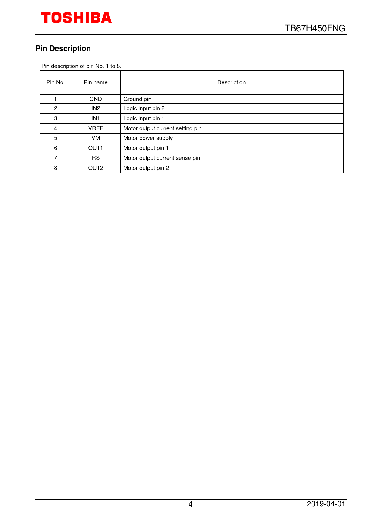 Pin description of pin No. 1 to 8. Pin No. Pin name Description 1 GND Ground pin 2 IN2 Logic input pin 2 3 IN1 Logic input pin 1 4 VREF Motor output current setting pin 5 VM Motor power supply 6 OUT1 Motor output pin 1 7 RS Motor output current sense pin 8 OUT2 Motor output pin 2 4 2019-04-01