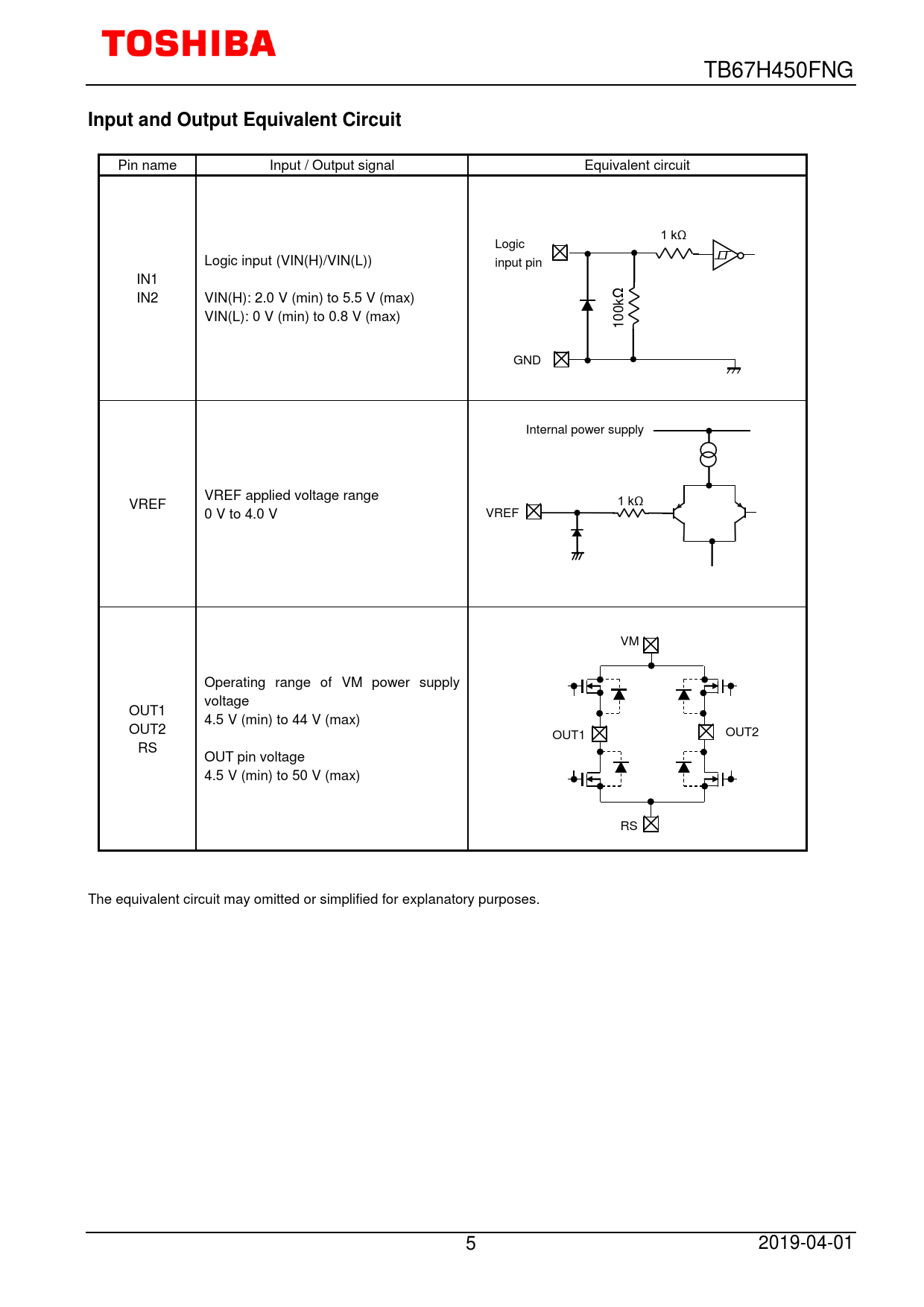 Pin name Input / Output signal Equivalent circuit 1 kΩ Logic Logic input (VIN(H)/VIN(L)) input pin IN1 IN2 VIN(H): 2.0 V (min) to 5.5 V (max) Ω VIN(L): 0 V (min) to 0.8 V (max) 100k GND Internal power supply VREF applied voltage range VREF 1 kΩ 0 V to 4.0 V VREF VM Operating range of VM power supply voltage OUT1 4.5 V (min) to 44 V (max) OUT2 OUT1 OUT2 RS OUT pin voltage 4.5 V (min) to 50 V (max) RS The equivalent circuit may omitted or simplified for explanatory purposes. 5 2019-04-01
