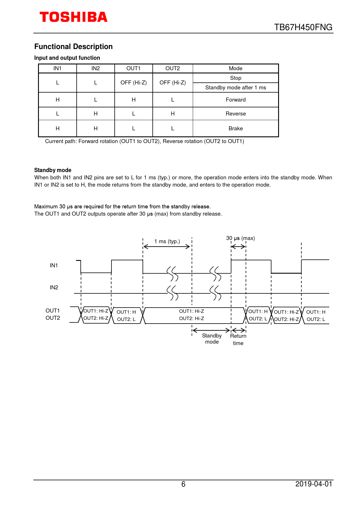 When both IN1 and IN2 pins are set to L for 1 ms (typ.) or more, the operation mode enters into the standby mode. When IN1 or IN2 is set to H, the mode returns from the standby mode, and enters to the operation mode. Maximum 30 μs are required for the return time from the standby release. The OUT1 and OUT2 outputs operate after 30 μs (max) from standby release. 30 μs (max) 1 ms (typ.) IN1 IN2 OUT1 OUT1: Hi-Z OUT1: H OUT1: Hi-Z OUT1: H OUT1: Hi-Z OUT1: H OUT2 OUT2: Hi-Z OUT2: L OUT2: Hi-Z OUT2: L OUT2: Hi-Z OUT2: L Standby Return mode time 6 2019-04-01
