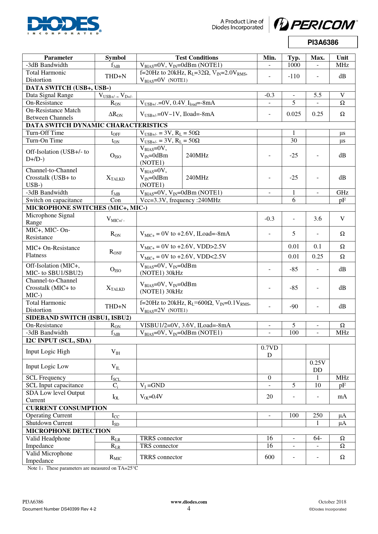 | Pages / Page | 9 / 4 — PI3A6386. Parameter. Symbol. Test Conditions. Min. Typ. Max. Unit. DATA … |