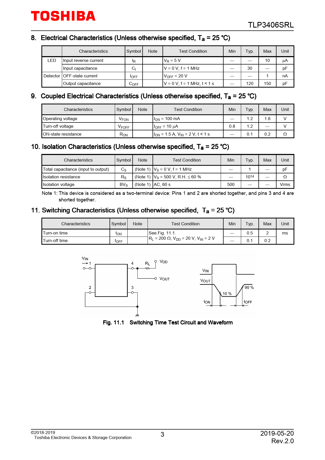 TLP3406SRL 8. Electrical Characteristics (Unless otherwise specified, Ta = 25 ) Characteristics Symbol Note Test Condition Min Typ. Max Unit LED Input reverse current IR VR = 5 V 10 µA Input capacitance Ct V = 0 V, f = 1 MHz 30 pF Detector OFF-state current IOFF VOFF = 20 V 1 nA Output capacitance COFF V = 0 V, f = 1 MHz, t < 1 s 120 150 pF 9. Coupled Electrical Characteristics (Unless otherwise specified, Ta = 25 ) Characteristics Symbol Note Test Condition Min Typ. Max Unit Operating voltage VFON ION = 100 mA 1.2 1.6 V Turn-off voltage VFOFF IOFF = 10 µA 0.8 1.2 V ON-state resistance RON ION = 1.5 A, VIN = 2 V, t < 1 s 0.1 0.2 Ω 10. Isolation Characteristics (Unless otherwise specified, Ta = 25 ) Characteristics Symbol Note Test Condition Min Typ. Max Unit Total capacitance (input to output) CS (Note 1) VS = 0 V, f = 1 MHz 1 pF Isolation resistance RS (Note 1) VS = 500 V, R.H. ≤ 60 % 1014 Ω Isolation voltage BVS (Note 1) AC, 60 s 500 Vrms Note 1: This device is considered as a two-terminal device: Pins 1 and 2 are shorted together, and pins 3 and 4 are shorted together. 11. Switching Characteristics (Unless otherwise specified, Ta = 25 ) Characteristics Symbol Note Test Condition Min Typ. Max Unit Turn-on time tON See Fig. 11.1. 0.5 2 ms Turn-off time t RL = 200 Ω, VDD = 20 V, VIN = 2 V OFF 0.1 0.2 Fig. 11.1 Switching Time Test Circuit and Waveform ©2018-2019 3 2019-05-20 Toshiba Electronic Devices & Storage Corporation Rev.2.0