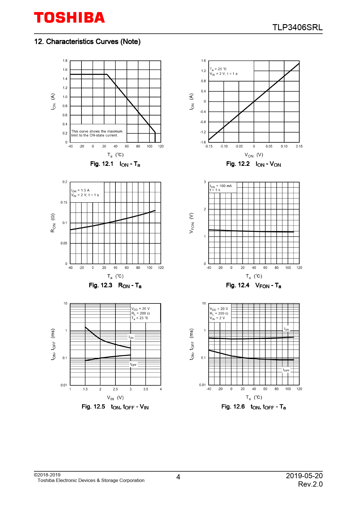 TLP3406SRL. 12. Characteristics. Curves. (Note). Fig. 12.1. ION. -. Ta. Fig. 12.2. ION. -. VON. Fig. 12.3. RON. -. Ta. Fig. 12.4. VFON. -. Ta. Fig. 12.5. tON,. tOFF. -. VIN. Fig. 12.6