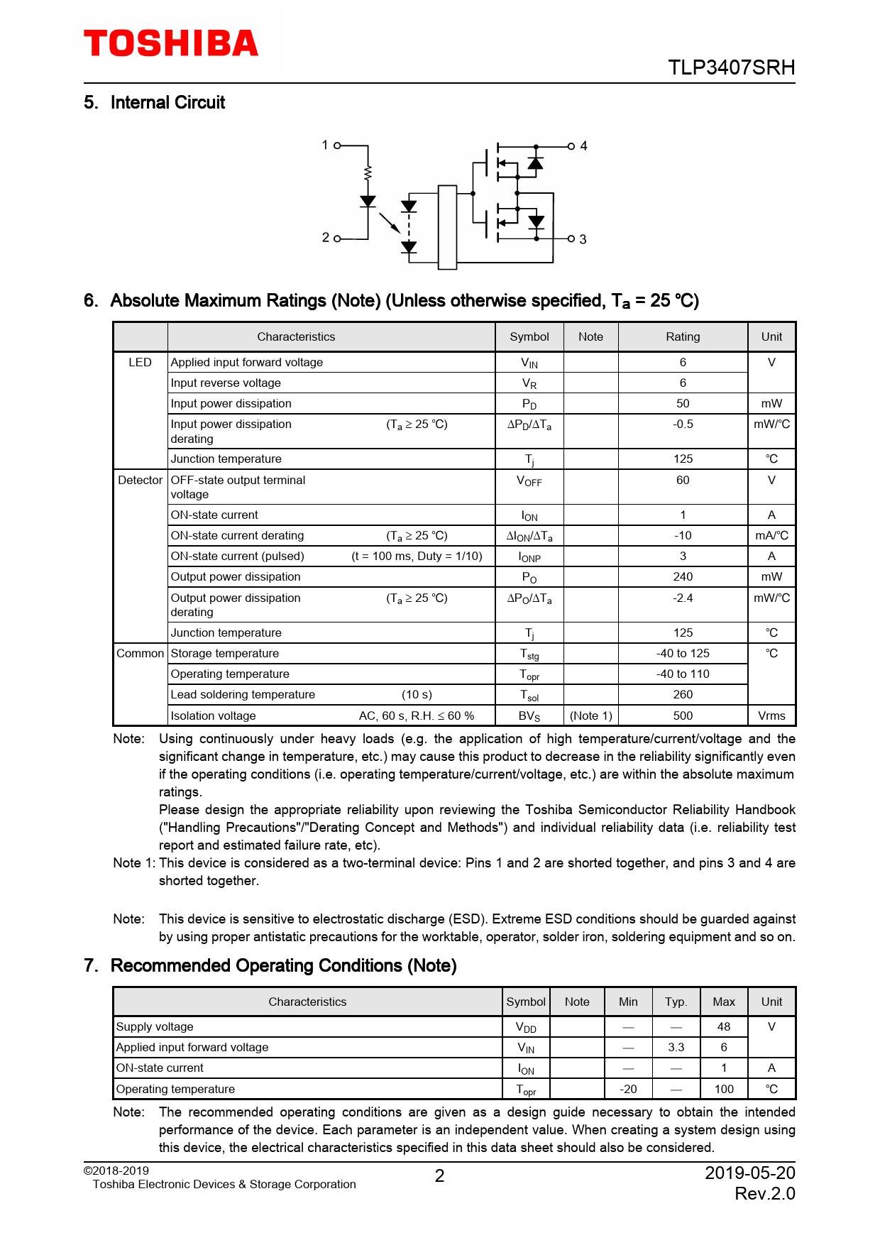 | Pages / Page | 14 / 2 — TLP3407SRH. 5. Internal. Circuit. 6. Absolute. Maximum. Ratings. (Note). … |