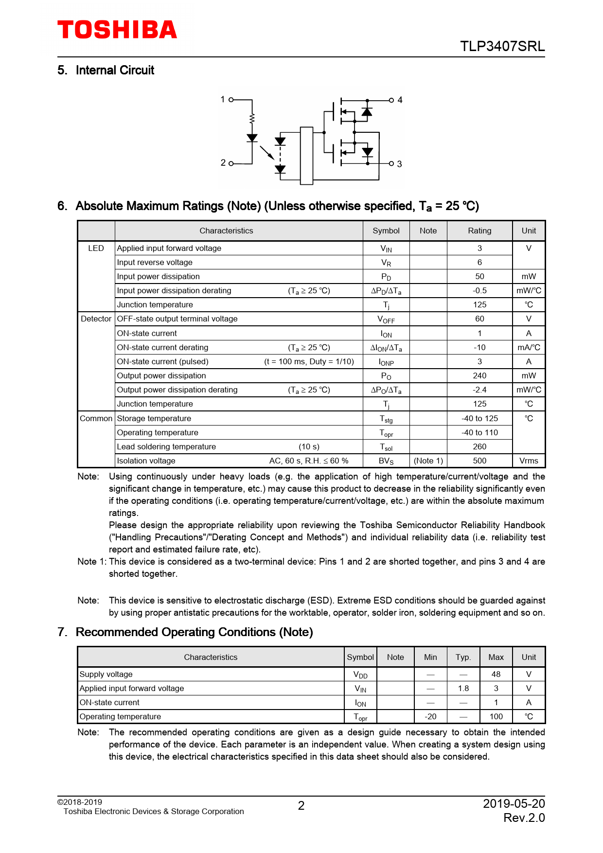 | Pages / Page | 14 / 2 — TLP3407SRL. 5. Internal. Circuit. 6. Absolute. Maximum. Ratings. (Note). … |