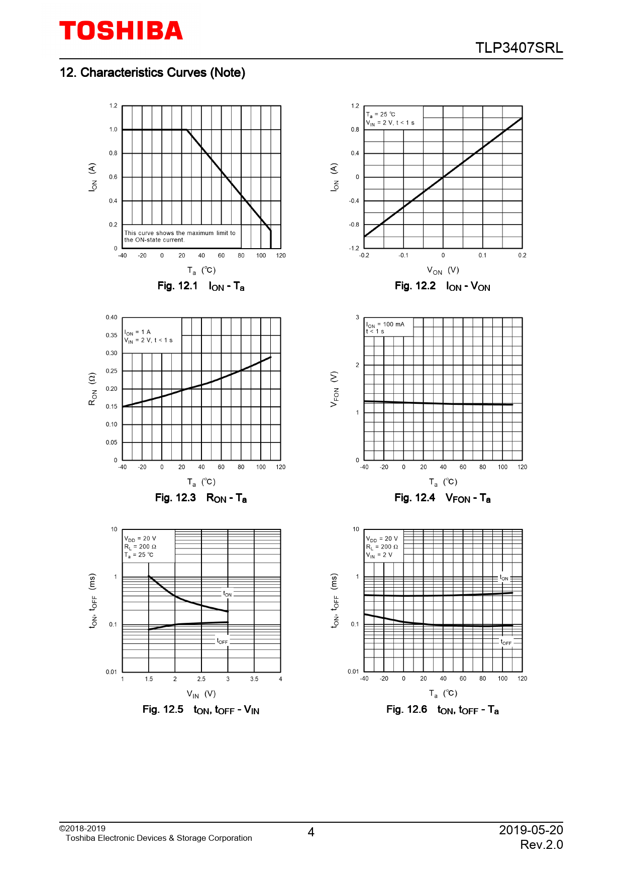 TLP3407SRL. 12. Characteristics. Curves. (Note). Fig. 12.1. ION. -. Ta. Fig. 12.2. ION. -. VON. Fig. 12.3. RON. -. Ta. Fig. 12.4. VFON. -. Ta. Fig. 12.5. tON,. tOFF. -. VIN. Fig. 12.6
