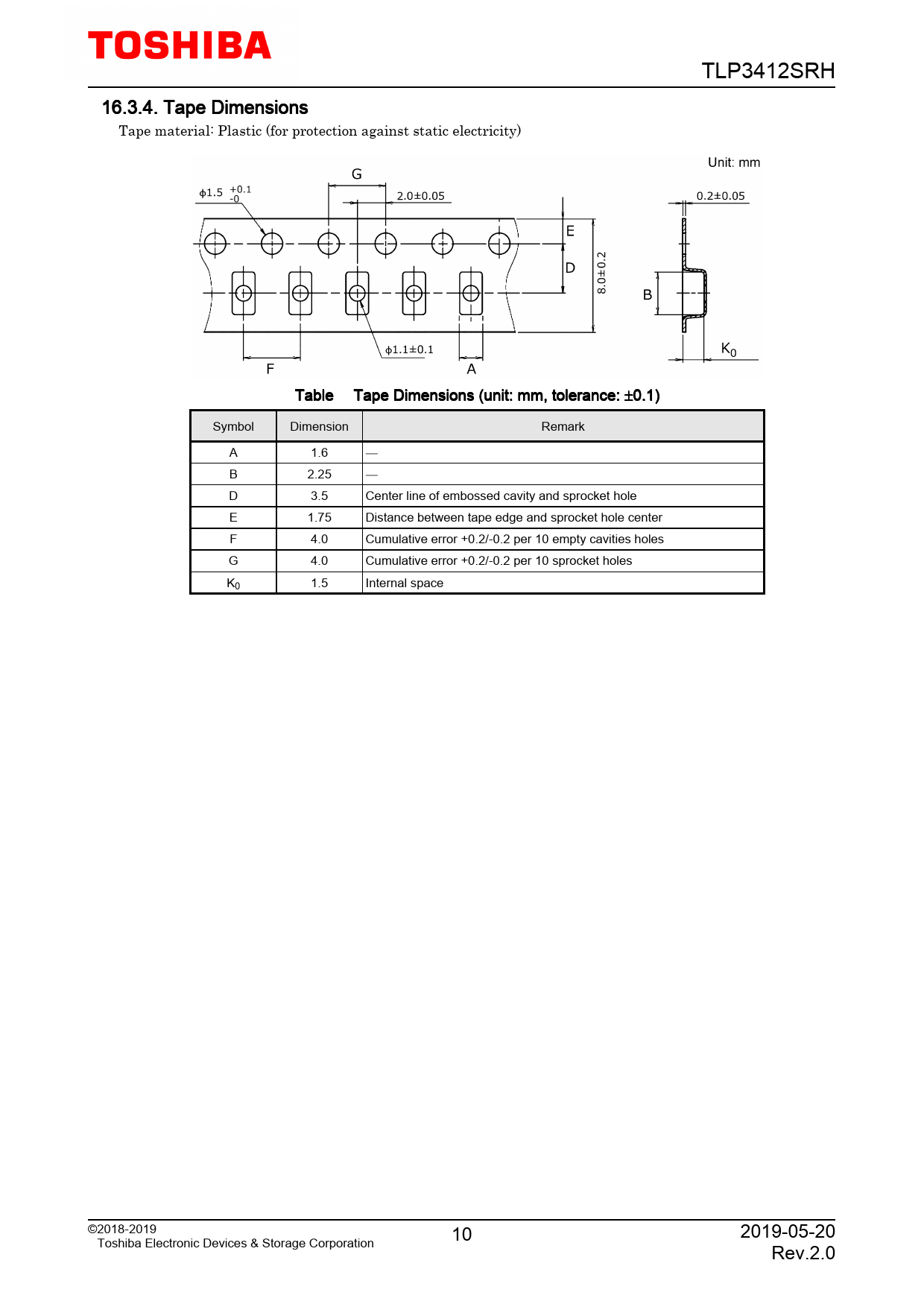 TLP3412SRH 16.3.4. Tape Dimensions Tape material: Plastic (for protection against static electricity) Table Tape Dimensions (unit: mm, tolerance: ±0.1) Symbol Dimension Remark A 1.6 B 2.25 D 3.5 Center line of embossed cavity and sprocket hole E 1.75 Distance between tape edge and sprocket hole center F 4.0 Cumulative error +0.2/-0.2 per 10 empty cavities holes G 4.0 Cumulative error +0.2/-0.2 per 10 sprocket holes K0 1.5 Internal space ©2018-2019 10 2019-05-20 Toshiba Electronic Devices & Storage Corporation Rev.2.0