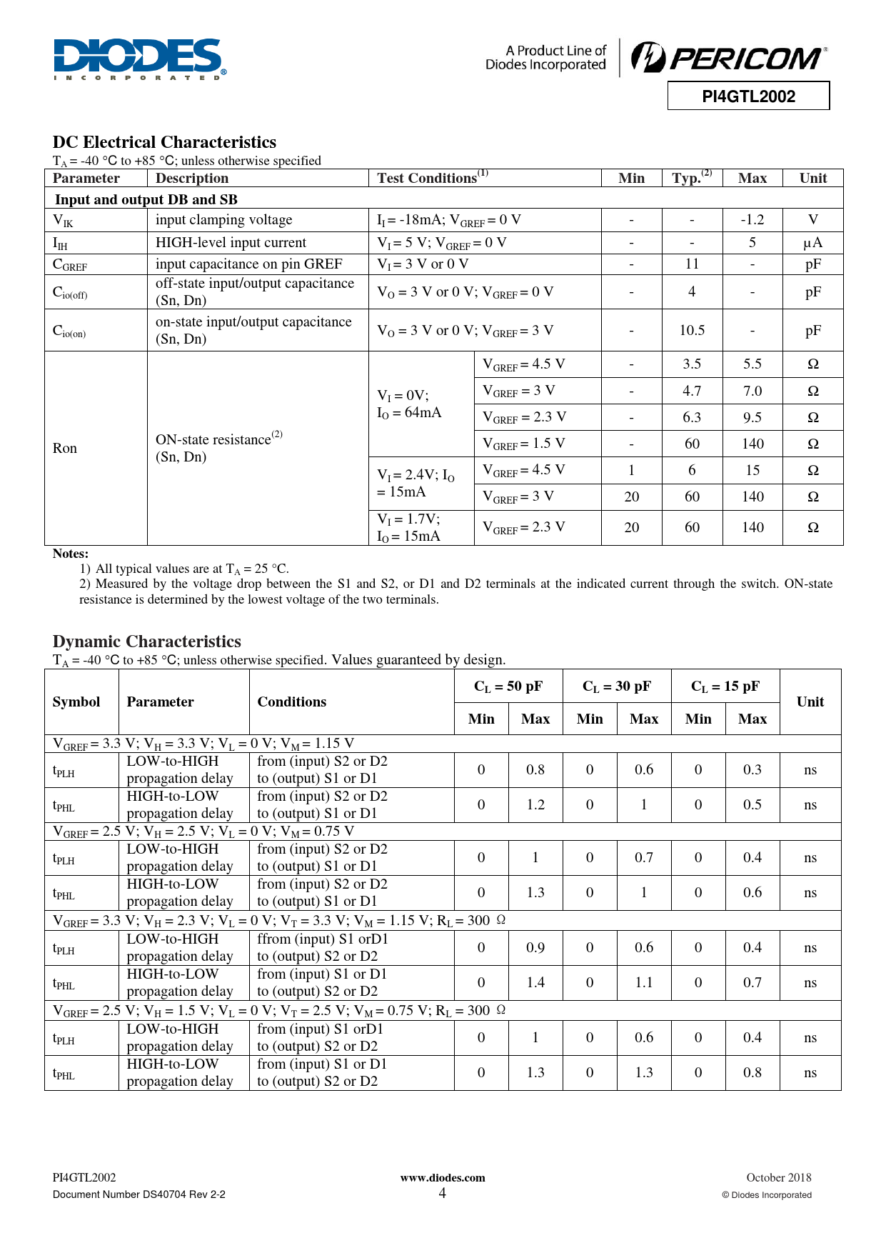 VGREF = 3.3 V; VH = 3.3 V; VL = 0 V; VM = 1.15 V LOW-to-HIGH from (input) S2 or D2 tPLH 0 0.8 0 0.6 0 0.3 ns propagation delay to (output) S1 or D1 HIGH-to-LOW from (input) S2 or D2 tPHL 0 1.2 0 1 0 0.5 ns propagation delay to (output) S1 or D1 VGREF = 2.5 V; VH = 2.5 V; VL = 0 V; VM = 0.75 V LOW-to-HIGH from (input) S2 or D2 tPLH 0 1 0 0.7 0 0.4 ns propagation delay to (output) S1 or D1 HIGH-to-LOW from (input) S2 or D2 tPHL 0 1.3 0 1 0 0.6 ns propagation delay to (output) S1 or D1 VGREF = 3.3 V; VH = 2.3 V; VL = 0 V; VT = 3.3 V; VM = 1.15 V; RL = 300 Ω LOW-to-HIGH ffrom (input) S1 orD1 tPLH 0 0.9 0 0.6 0 0.4 ns propagation delay to (output) S2 or D2 HIGH-to-LOW from (input) S1 or D1 tPHL 0 1.4 0 1.1 0 0.7 ns propagation delay to (output) S2 or D2 VGREF = 2.5 V; VH = 1.5 V; VL = 0 V; VT = 2.5 V; VM = 0.75 V; RL = 300 Ω LOW-to-HIGH from (input) S1 orD1 tPLH 0 1 0 0.6 0 0.4 ns propagation delay to (output) S2 or D2 HIGH-to-LOW from (input) S1 or D1 tPHL 0 1.3 0 1.3 0 0.8 ns propagation delay to (output) S2 or D2 PI4GTL2002