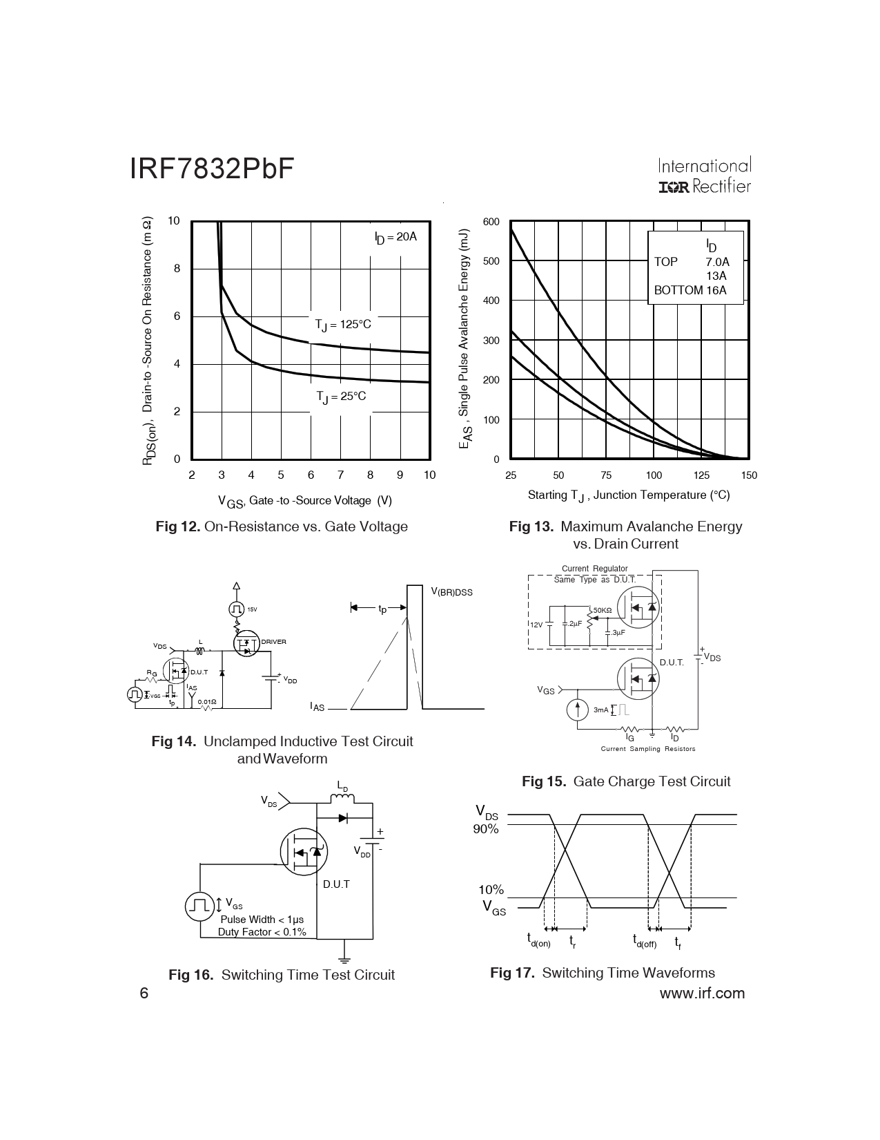 IRF7832PbF ) 10 600 Ω ) I J m( D = 20A m( I e D c y 500 n g a 8 r TOP 7.0A t e si n 13A s E BOTTOM 16A e e 400 R h n c 6 n O T al e J = 125°C a cr v 300 u A o e S s - 4 l u ot P - 200 n e i l a T g r J = 25°C ni D 2 S , 100 ) n S o( A S E D 0 0 R 2 3 4 5 6 7 8 9 10 25 50 75 100 125 150 Starting T V J , Junction Temperature (°C) GS, Gate -to -Source Voltage (V) Fig 12. On-Resistance vs. Gate Voltage Fig 13. Maximum Avalanche Energy vs. Drain Current Current Regulator Same Type as D.U.T. V(BR)DSS 15V tp 50KΩ .2µF 12V .3µF L V DRIVER DS +V D.U.T. DS - RG D.U.T + - VDD IAS A VGS 20V VGS tp 0.01Ω IAS 3mA I I G D Fig 14. Unclamped Inductive Test Circuit Current Sampling Resistors and Waveform L Fig 15. Gate Charge Test Circuit D VDS VDS + 90% V - DD D.U.T 10% VGS VGS Pulse Width < 1µs Duty Factor < 0.1% td(on) t t r d(off) tf Fig 16. Switching Time Test Circuit Fig 17. Switching Time Waveforms 6 www.irf.com