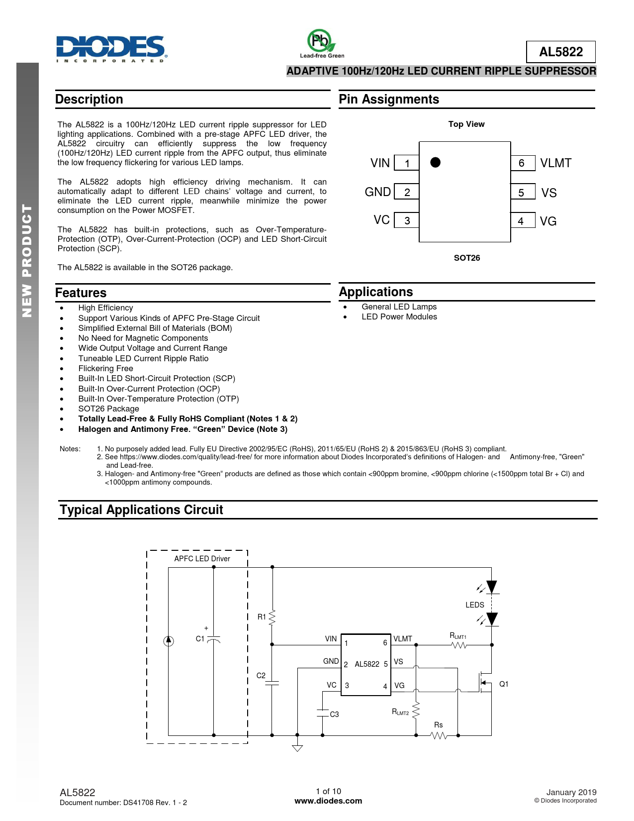 APFC LED Driver LEDS R1 + R C1 VIN VLMT LMT1 1 6 GND 2 AL5822 5 VS C2 VC 3 4 VG Q1 C3 RLMT2 Rs AL5822 1 of 10 January 2019 Document number: DS41708 Rev. 1 - 2