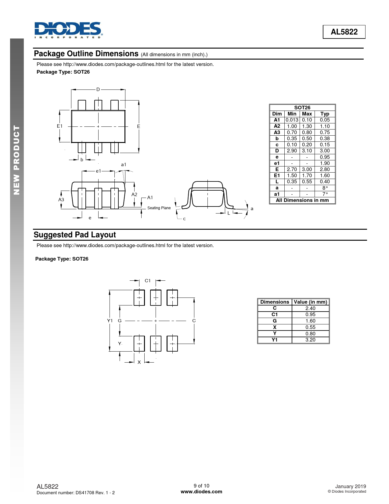 AL5822. Package Outline Dimensions. Package Type: SOT26. SOT26. Dim Min Max. Typ. All Dimensions in mm. Suggested Pad Layout