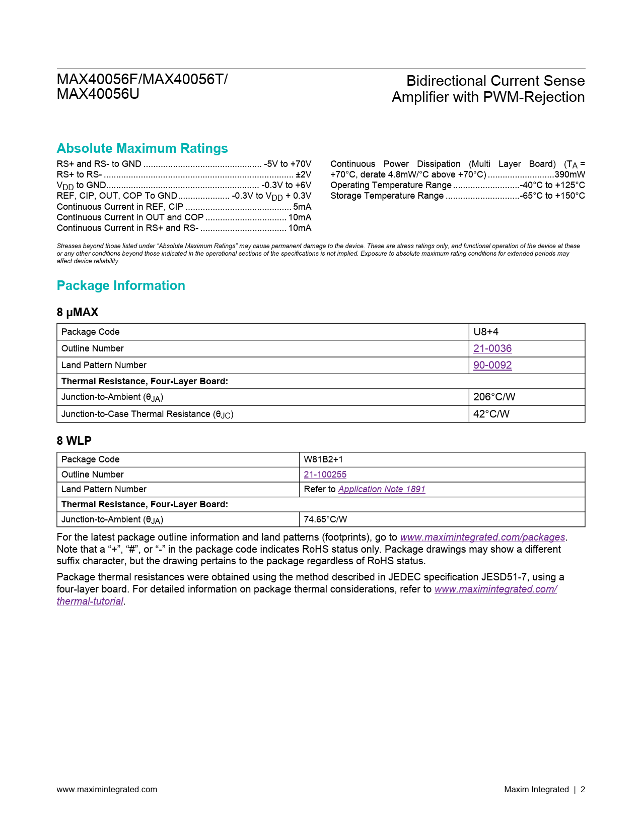 MAX40056F/MAX40056T/ Bidirectional Current Sense MAX40056U Amplifier with PWM-Rejection Absolute Maximum Ratings RS+ and RS- to GND .. -5V to +70V Continuous Power Dissipation (Multi Layer Board) (TA = RS+ to RS- ... ±2V +70°C, derate 4.8mW/°C above +70°C) ...390mW VDD to GND .. -0.3V to +6V Operating Temperature Range ...-40°C to +125°C REF, CIP, OUT, COP To GND ... -0.3V to VDD + 0.3V Storage Temperature Range ..-65°C to +150°C Continuous Current in REF, CIP ... 5mA Continuous Current in OUT and COP ... 10mA Continuous Current in RS+ and RS- ... 10mA Stresses beyond those listed under “Absolute Maximum Ratings” may cause permanent damage to the device. These are stress ratings only, and functional operation of the device at these or any other conditions beyond those indicated in the operational sections of the specifications is not implied. Exposure to absolute maximum rating conditions for extended periods may affect device reliability. Package Information8 µMAX Package Code U8+4 Outline Number 21-0036 Land Pattern Number 90-0092 Thermal Resistance, Four-Layer Board: Junction-to-Ambient (θJA) 206°C/W Junction-to-Case Thermal Resistance (θJC) 42°C/W 8 WLP Package Code W81B2+1 Outline Number 21-100255 Land Pattern Number Refer to Application Note 1891 Thermal Resistance, Four-Layer Board: Junction-to-Ambient (θJA) 74.65°C/W For the latest package outline information and land patterns (footprints), go to www.maximintegrated.com/packages. Note that a “+”, “#”, or “-” in the package code indicates RoHS status only. Package drawings may show a different suffix character, but the drawing pertains to the package regardless of RoHS status. Package thermal resistances were obtained using the method described in JEDEC specification JESD51-7, using a four-layer board. For detailed information on package thermal considerations, refer to www.maximintegrated.com/ thermal-tutorial. www.maximintegrated.com Maxim Integrated | 2 Document Outline General Description Applications Benefits and Features Typical Operating Characteristic and Simplified Block Diagram Absolute Maximum Ratings Package Information 8 µMAX 8 WLP Electrical Characteristics Typical Operating Characteristics Pin Configuration Pin Description Detailed Description Overview PWM Rejection Input Stage Low Input Offset Voltage and Low Gain Error CSA Output Voltage Reference Window Comparator and Hysteresis Applications Information Input Sense Voltage Range Choice of Reference Voltage Important Considerations Kelvin Connections Stray Inductance Typical Application Circuits Current Sensing in a 3-Phase Servo Motor Ordering Information Revision History