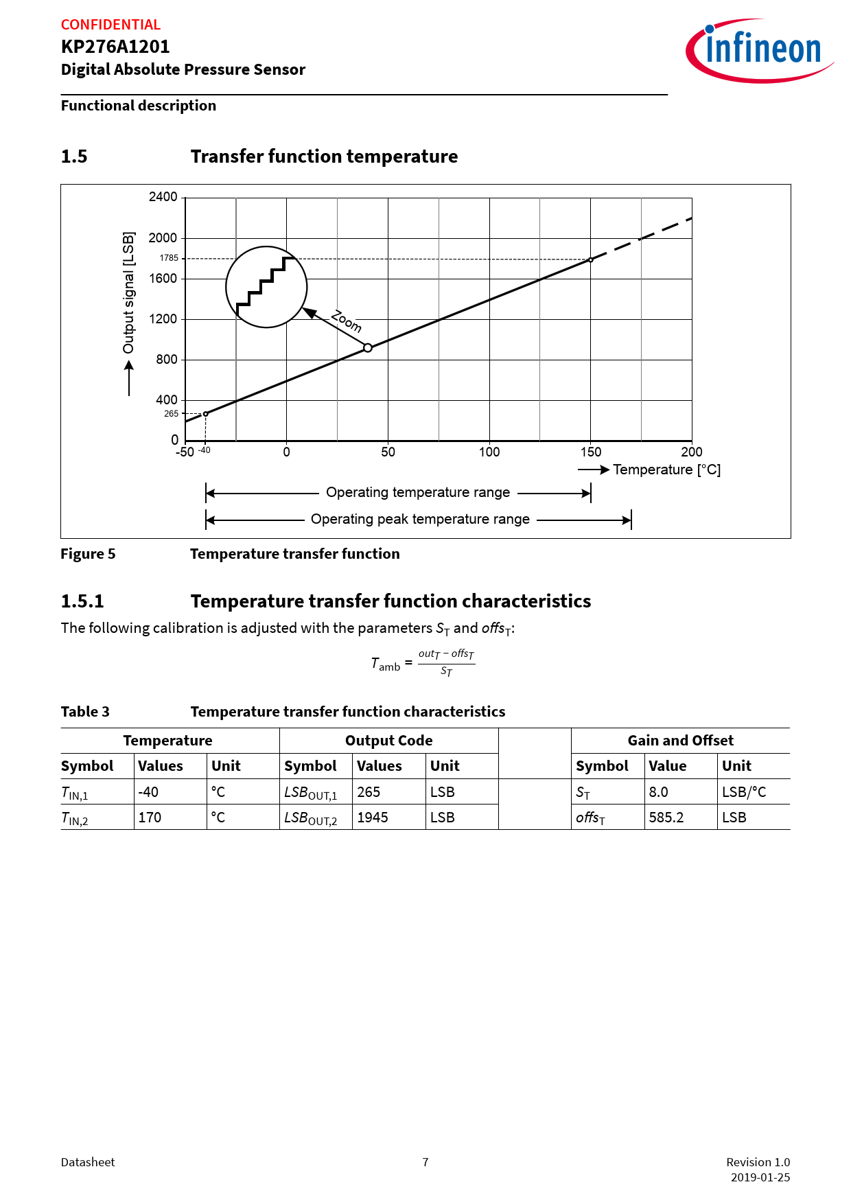 CONFIDENTIALKP276A1201Digital Absolute Pressure SensorFunctional description1.5Transfer function temperature 2400 2000 1785 [LSB] 1600 1200 Zoom Output signal 800 400 265 0-50 -40 0 50 100 150 200 Temperature [°C] Operating temperature range Operating peak temperature range Figure 5Temperature transfer function1.5.1Temperature transfer function characteristics The following calibration is adjusted with the parameters ST and offsT: Tamb = outT − offsT ST Table 3Temperature transfer function characteristicsTemperatureOutput CodeGain and OffsetSymbolValuesUnitSymbolValuesUnitSymbolValueUnit TIN,1 -40 °C LSBOUT,1 265 LSB ST 8.0 LSB/°C TIN,2 170 °C LSBOUT,2 1945 LSB offsT 585.2 LSB Datasheet 7 Revision 1.0 2019-01-25 Document Outline dTurboTMAP with SENT Output and Temperature Sensor Interface Features Potential applications Product validation Description Table of contents 1 Functional description 1.1 Pin configuration 1.2 Pin description 1.3 Block Diagram 1.4 Transfer function pressure 1.4.1 Pressure transfer function characteristics 1.4.2 Pressure accuracy 1.5 Transfer function temperature 1.5.1 Temperature transfer function characteristics 1.6 SENT interface 1.6.1 Physical layer 1.6.2 Data link layer 1.6.2.1 Nibble specification 1.6.2.2 Status and communication nibble 1.6.2.3 Enhanced serial message format 1.6.2.4 Enhanced serial message data 1.6.3 Pressure channel output codes 1.6.4 Temperature channel output codes 1.6.5 Diagnostic Error Codes 1.6.5.1 Signal out of range 1.6.5.2 Diag1 1.6.5.3 Diag2 1.6.5.4 EEPROM Check 1.6.6 Definition of Pressure signal path latency 1.7 External temperature sensor 1.7.1 Linearization of the external temperature sensor transfer function 1.7.2 Accuracy for NTC signal processing 2 Specification 2.1 Application circuit example 2.2 Application circuit example for EMC 2.3 Absolute maximum ratings 2.4 Operating range 2.5 Characteristics 3 Package information 3.1 PG-DSOF-8-162 Outline 3.2 Identification code Revision history Disclaimer