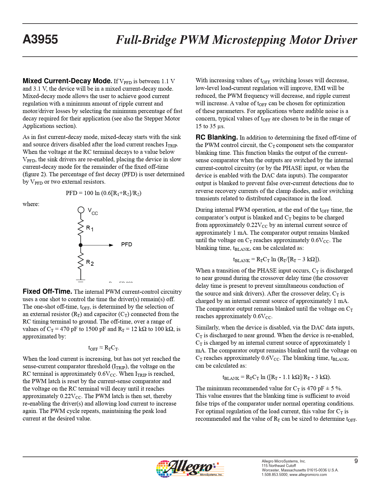 A3955. Full-Bridge PWM Microstepping Motor Driver. Mixed Current-Decay Mode. RC Blanking. Fixed Off-Time