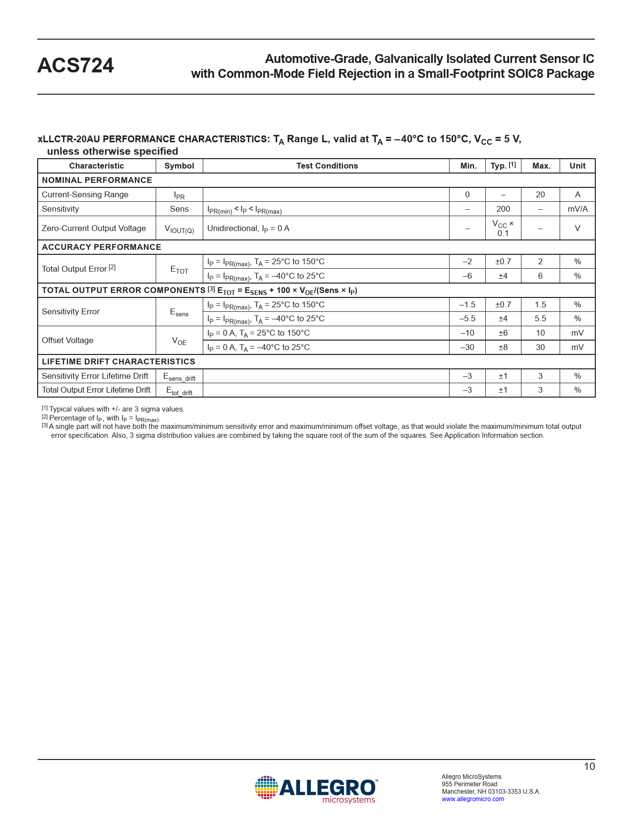 Automotive-Grade, Galvanically Isolated Current Sensor ICACS724with Common-Mode Field Rejection in a Small-Footprint SOIC8 PackagexLLCTR-20AU PERFORMANCE CHARACTERISTICS: TA Range L, valid at TA = – 40°C to 150°C, VCC = 5 V,unless otherwise specifiedCharacteristicSymbolTest ConditionsMin. Typ. [1]Max.UnitNOMINAL PERFORMANCE Current-Sensing Range IPR 0 – 20 A Sensitivity Sens IPR(min) < IP < IPR(max) – 200 – mV/A Zero-Current Output Voltage VIOUT(Q) Unidirectional, IP = 0 A – VCC × 0.1 – V ACCURACY PERFORMANCE I Total Output Error [2] E P = IPR(max), TA = 25°C to 150°C –2 ±0.7 2 % TOT IP = IPR(max), TA = –40°C to 25°C –6 ±4 6 % TOTAL OUTPUT ERROR COMPONENTS [3] ETOT = ESENS + 100 × VOE/(Sens × IP) I Sensitivity Error E P = IPR(max), TA = 25°C to 150°C –1.5 ±0.7 1.5 % sens IP = IPR(max), TA = –40°C to 25°C –5.5 ±4 5.5 % I Offset Voltage V P = 0 A, TA = 25°C to 150°C –10 ±6 10 mV OE IP = 0 A, TA = –40°C to 25°C –30 ±8 30 mV LIFETIME DRIFT CHARACTERISTICS Sensitivity Error Lifetime Drift Esens_drift –3 ±1 3 % Total Output Error Lifetime Drift Etot_drift –3 ±1 3 % [1] Typical values with +/- are 3 sigma values. [2] Percentage of IP , with IP = IPR(max). [3] A single part will not have both the maximum/minimum sensitivity error and maximum/minimum offset voltage, as that would violate the maximum/minimum total output error specification. Also, 3 sigma distribution values are combined by taking the square root of the sum of the squares. See Application Information section. 10 Allegro MicroSystems 955 Perimeter Road Manchester, NH 03103-3353 U.S.A. www.allegromicro.com