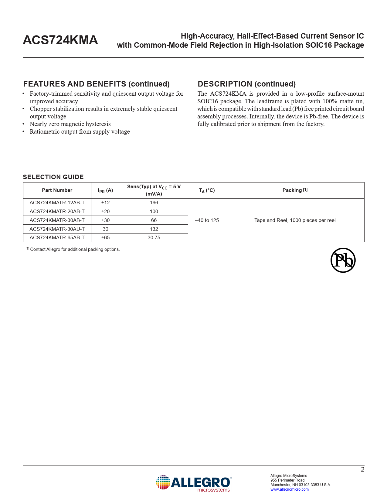 ACS724KMATR-12AB-T ±12 166 ACS724KMATR-20AB-T ±20 100 ACS724KMATR-30AB-T ±30 66 –40 to 125 Tape and Reel, 1000 pieces per reel ACS724KMATR-30AU-T 30 132 ACS724KMATR-65AB-T ±65 30.75 [1] Contact Allegro for additional packing options. 2 Allegro MicroSystems 955 Perimeter Road Manchester, NH 03103-3353 U.S.A. www.allegromicro.com