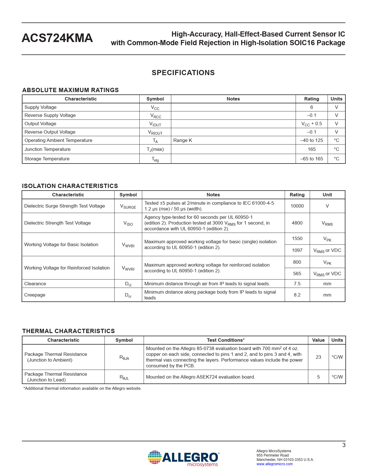 High-Accuracy, Hall-Effect-Based Current Sensor IC ACS724KMA with Common-Mode Field Rejection in High-Isolation SOIC16 Package SPECIFICATIONS ABSOLUTE MAXIMUM RATINGS Characteristic Symbol Notes Rating Units