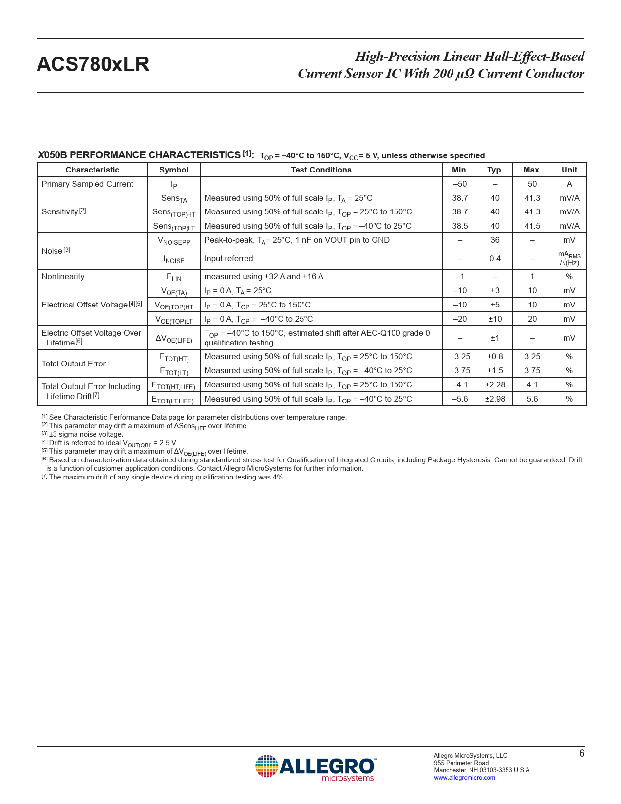 High-Precision Linear Hall-Effect-Based ACS780xLR Current Sensor IC With 200 µΩ Current Conductor X 050B PERFORMANCE CHARACTERISTICS [1]: TOP = –40°C to 150°C, VCC = 5 V, unless otherwise specified Characteristic Symbol Test Conditions Min. Typ. Max. Unit