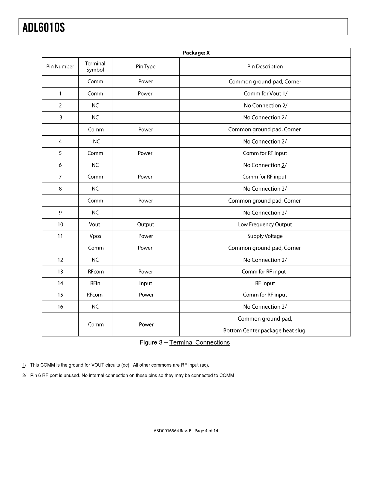 Figure 3 – Terminal Connections 1/ This COMM is the ground for VOUT circuits (dc). All other commons are RF input (ac). 2/ Pin 6 RF port is unused. No internal connection on these pins so they may be connected to COMM