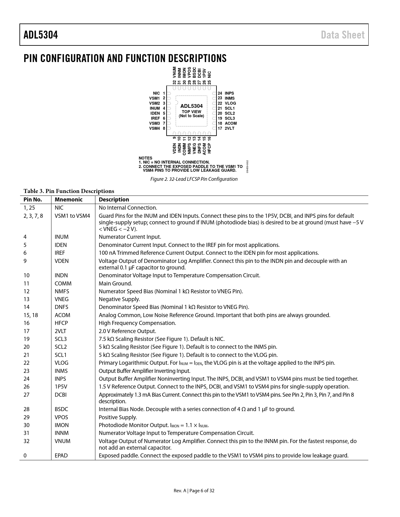 1, 25 NIC No Internal Connection. 2, 3, 7, 8 VSM1 to VSM4 Guard Pins for the INUM and IDEN Inputs. Connect these pins to the 1P5V, DCBI, and INPS pins for default single-supply setup; connect to ground if INUM (photodiode bias) is desired to be at ground (must have −5 V < VNEG < −2 V). 4 INUM Numerator Current Input. 5 IDEN Denominator Current Input. Connect to the IREF pin for most applications. 6 IREF 100 nA Trimmed Reference Current Output. Connect to the IDEN pin for most applications. 9 VDEN Voltage Output of Denominator Log Amplifier. Connect this pin to the INDN pin and decouple with an external 0.1 µF capacitor to ground. 10 INDN Denominator Voltage Input to Temperature Compensation Circuit. 11 COMM Main Ground. 12 NMFS Numerator Speed Bias (Nominal 1 kΩ Resistor to VNEG Pin). 13 VNEG Negative Supply. 14 DNFS Denominator Speed Bias (Nominal 1 kΩ Resistor to VNEG Pin). 15, 18 ACOM Analog Common, Low Noise Reference Ground. Important that both pins are always grounded. 16 HFCP High Frequency Compensation. 17 2VLT 2.0 V Reference Output. 19 SCL3 7.5 kΩ Scaling Resistor (See Figure 1). Default is NIC. 20 SCL2 5 kΩ Scaling Resistor (See Figure 1). Default is to connect to the INMS pin. 21 SCL1 5 kΩ Scaling Resistor (See Figure 1). Default is to connect to the VLOG pin. 22 VLOG Primary Logarithmic Output. For INUM = IDEN, the VLOG pin is at the voltage applied to the INPS pin. 23 INMS Output Buffer Amplifier Inverting Input. 24 INPS Output Buffer Amplifier Noninverting Input. The INPS, DCBI, and VSM1 to VSM4 pins must be tied together. 26 1P5V 1.5 V Reference Output. Connect to the INPS, DCBI, and VSM1 to VSM4 pins for single-supply operation. 27 DCBI Approximately 1.3 mA Bias Current. Connect this pin to the VSM1 to VSM4 pins. See Pin 2, Pin 3, Pin 7, and Pin 8 description. 28 BSDC Internal Bias Node. Decouple with a series connection of 4 Ω and 1 µF to ground. 29 VPOS Positive Supply. 30 IMON Photodiode Monitor Output. IMON = 1.1 × INUM. 31 INNM Numerator Voltage Input to Temperature Compensation Circuit. 32 VNUM Voltage Output of Numerator Log Amplifier. Connect this pin to the INNM pin. For the fastest response, do not add an external capacitor. 0 EPAD Exposed paddle. Connect the exposed paddle to the VSM1 to VSM4 pins to provide low leakage guard. Rev. A | Page 6 of 32 Document Outline FEATURES APPLICATIONS GENERAL DESCRIPTION SIMPLIFIED BLOCK DIAGRAM TABLE OF CONTENTS REVISION HISTORY SPECIFICATIONS ABSOLUTE MAXIMUM RATINGS ESD CAUTION PIN CONFIGURATION AND FUNCTION DESCRIPTIONS TYPICAL PERFORMANCE CHARACTERISTICS TEST CIRCUITS TERMINOLOGY THEORY OF OPERATION BASIC CONCEPTS OPTICAL MEASUREMENTS Decibel Scaling CIRCUIT DESCRIPTION Bandwidth vs. Current Noise vs. Current Filtering to Improve Noise and Dynamic Behavior Photodiode Bias Reference Outputs Buffer Amplifier Setting the Log Slope and Intercept Slope Inversion Log Ratio Operation APPLICATIONS INFORMATION USING THE ADL5304 Using the Adaptive Bias Summing Node Voltage Leakage VLOG Output Dynamic Response USING A NEGATIVE SUPPLY EVALUATION BOARD SCHEMATIC AND SILKSCREENS OUTLINE DIMENSIONS ORDERING GUIDE