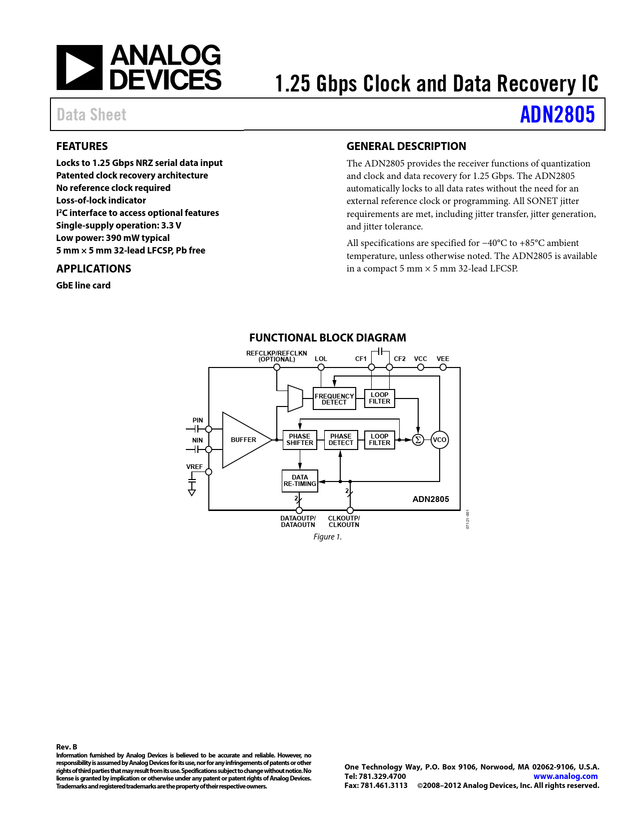 1.25 Gbps Clock and Data Recovery IC. Data Sheet. ADN2805. FEATURES. GENERAL DESCRIPTION