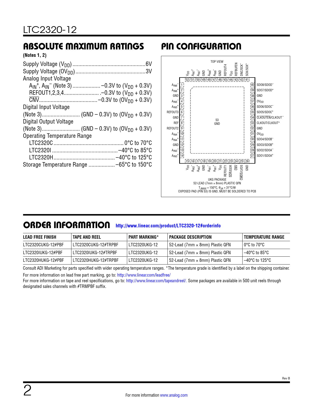 LTC2320CUKG-12#PBF LTC2320CUKG-12#TRPBF LTC2320UKG-12 52-Lead (7mm × 8mm) Plastic QFN 0°C to 70°C LTC2320IUKG-12#PBF LTC2320IUKG-12#TRPBF LTC2320UKG-12 52-Lead (7mm × 8mm) Plastic QFN –40°C to 85°C LTC2320HUKG-12#PBF LTC2320HUKG-12#TRPBF LTC2320UKG-12 52-Lead (7mm × 8mm) Plastic QFN –40°C to 125°C Consult ADI Marketing for parts specified with wider operating temperature ranges. *The temperature grade is identified by a label on the shipping container. For more information on lead free part marking, go to: http://www.linear.com/leadfree/ For more information on tape and reel specifications, go to: http://www.linear.com/tapeandreel/. Some packages are available in 500 unit reels through designated sales channels with #TRMPBF suffix. Rev B 2 For more information www.analog.com Document Outline Features Applications Description Typical Application Absolute Maximum Ratings Pin Configuration Order Information Electrical Characteristics Converter Characteristics Internal Reference Characteristics Digital Inputs And Digital Outputs Power Requirements ADC Timing Characteristics Typical Performance Characteristics Pin Functions Functional Block Diagram Timing Diagram Applications Information Package Description Related Parts Features Applications Typical Application Description Absolute Maximum Ratings Order Information Pin Configuration Electrical Characteristics Converter Characteristics Dynamic Accuracy Internal Reference Characteristics Digital Inputs And Digital Outputs Power Requirements ADC Timing Characteristics ADC Timing Characteristics ADC Timing Characteristics Typical Performance Characteristics Pin Functions CMOS data output option (CMOS/LVDS = low) LVDS data output option (CMOS/LVDS = high or FLOAT) Functional Block Diagram Timing Diagram Applications Information OVERVIEW CONVERTER OPERATION TRANSFER FUNCTION INPUT DRIVE CIRCUITS ADC REFERENCE DYNAMIC PERFORMANCE POWER CONSIDERATIONS TIMING AND CONTROL DIGITAL INTERFACE BOARD LAYOUT Package Description Revision History Typical Application Related Parts