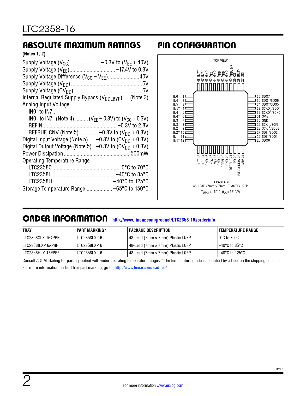 LTC2358CLX-16#PBF LTC2358LX-16 48-Lead (7mm × 7mm) Plastic LQFP 0°C to 70°C LTC2358ILX-16#PBF LTC2358LX-16 48-Lead (7mm × 7mm) Plastic LQFP –40°C to 85°C LTC2358HLX-16#PBF LTC2358LX-16 48-Lead (7mm × 7mm) Plastic LQFP –40°C to 125°C Consult ADI Marketing for parts specified with wider operating temperature ranges. *The temperature grade is identified by a label on the shipping container. For more information on lead free part marking, go to: http://www.linear.com/leadfree/ Rev A 2 For more information www.analog.com Document Outline FEATURES DESCRIPTION APPLICATIONS TYPICAL APPLICATION ABSOLUTE MAXIMUM RATINGS PIN CONFIGURATION ORDER INFORMATION ELECTRICAL CHARACTERISTICS CONVERTER CHARACTERISTICS DYNAMIC ACCURACY INTERNAL REFERENCE CHARACTERISTICS REFERENCE BUFFER CHARACTERISTICS DIGITAL INPUTS AND DIGITAL OUTPUTS POWER REQUIREMENTS POWER REQUIREMENTS ADC TIMING CHARACTERISTICS TYPICAL PERFORMANCE CHARACTERISTICS PIN FUNCTIONS CONFIGURATION TABLES FUNCTIONAL BLOCK DIAGRAM TIMING DIAGRAM APPLICATIONS INFORMATION BOARD LAYOUT PACKAGE DESCRIPTION REVISION HISTORY TYPICAL APPLICATION RELATED PARTS