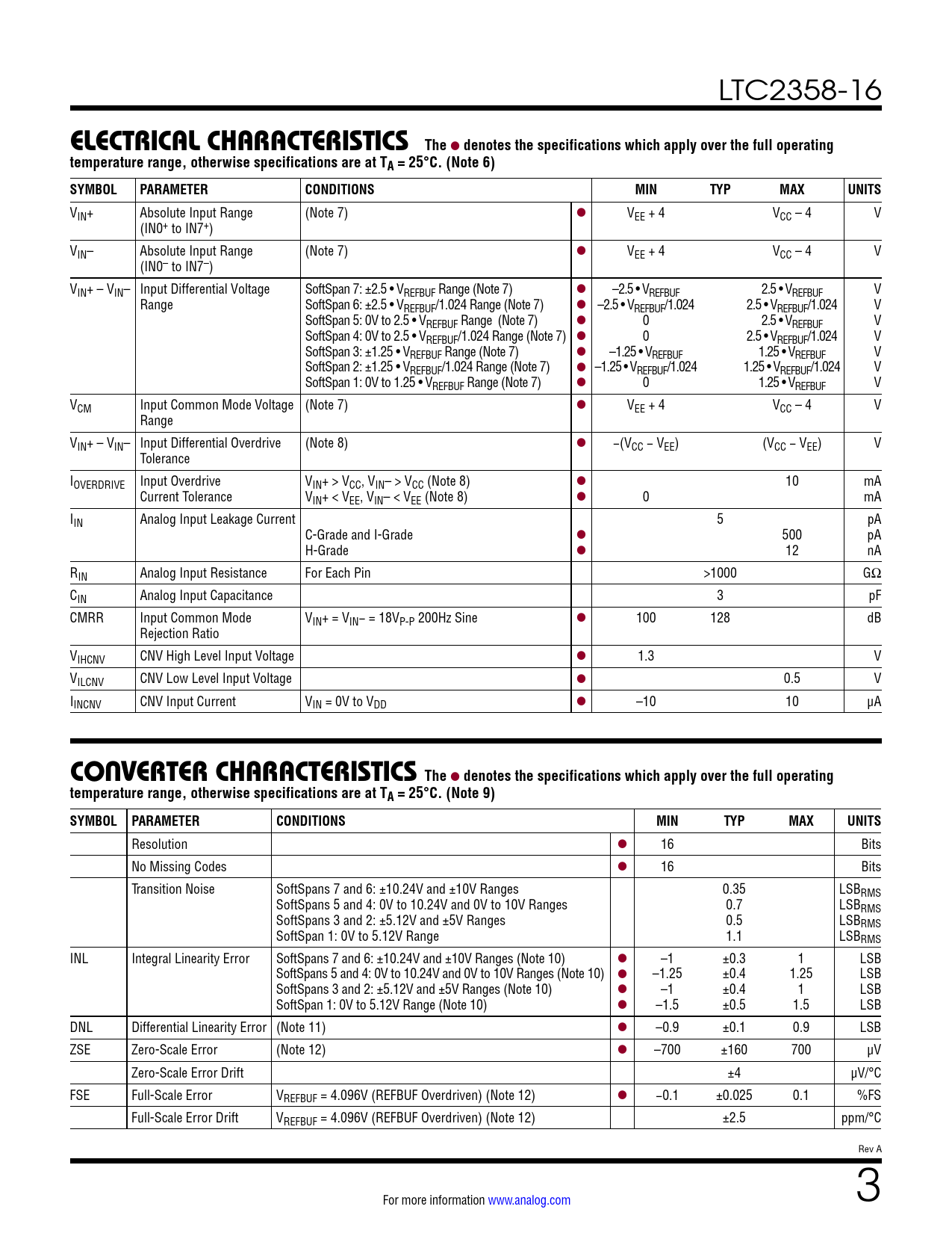 VIN+ Absolute Input Range (Note 7) l VEE + 4 VCC – 4 V (IN0+ to IN7+) VIN– Absolute Input Range (Note 7) l VEE + 4 VCC – 4 V (IN0– to IN7–) VIN+ – VIN– Input Differential Voltage SoftSpan 7: ±2.5 • VREFBUF Range (Note 7) l –2.5 • VREFBUF 2.5 • VREFBUF V Range SoftSpan 6: ±2.5 • VREFBUF/1.024 Range (Note 7) l –2.5 • VREFBUF/1.024 2.5 • VREFBUF/1.024 V SoftSpan 5: 0V to 2.5 • VREFBUF Range (Note 7) l 0 2.5 • VREFBUF V SoftSpan 4: 0V to 2.5 • VREFBUF/1.024 Range (Note 7) l 0 2.5 • VREFBUF/1.024 V SoftSpan 3: ±1.25 • VREFBUF Range (Note 7) l –1.25 • VREFBUF 1.25 • VREFBUF V SoftSpan 2: ±1.25 • VREFBUF/1.024 Range (Note 7) l –1.25 • VREFBUF/1.024 1.25 • VREFBUF/1.024 V SoftSpan 1: 0V to 1.25 • VREFBUF Range (Note 7) l 0 1.25 • VREFBUF V VCM Input Common Mode Voltage (Note 7) l VEE + 4 VCC – 4 V Range VIN+ – VIN– Input Differential Overdrive (Note 8) l −(VCC − VEE) (VCC − VEE) V Tolerance IOVERDRIVE Input Overdrive VIN+ > VCC, VIN– > VCC (Note 8) l 10 mA Current Tolerance VIN+ < VEE, VIN– < VEE (Note 8) l 0 mA IIN Analog Input Leakage Current 5 pA C-Grade and I-Grade l 500 pA H-Grade l 12 nA RIN Analog Input Resistance For Each Pin >1000 GΩ CIN Analog Input Capacitance 3 pF CMRR Input Common Mode VIN+ = VIN− = 18VP-P 200Hz Sine l 100 128 dB Rejection Ratio VIHCNV CNV High Level Input Voltage l 1.3 V VILCNV CNV Low Level Input Voltage l 0.5 V IINCNV CNV Input Current VIN = 0V to VDD l –10 10 μA